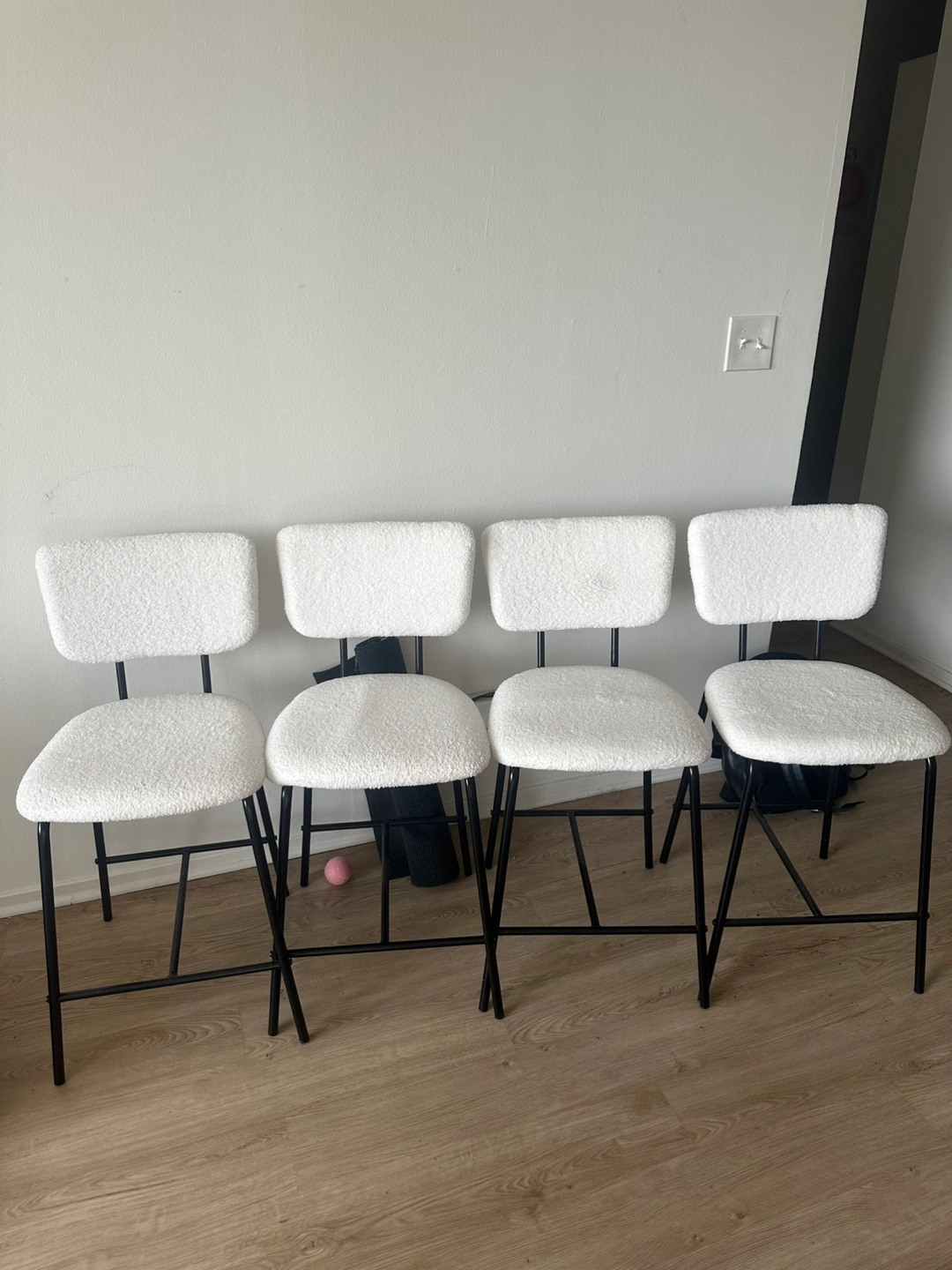 Selling a set of four counter stools with white boucle seats and black metal legs. They're in great shape and would look great in a modern kitchen or bar area!