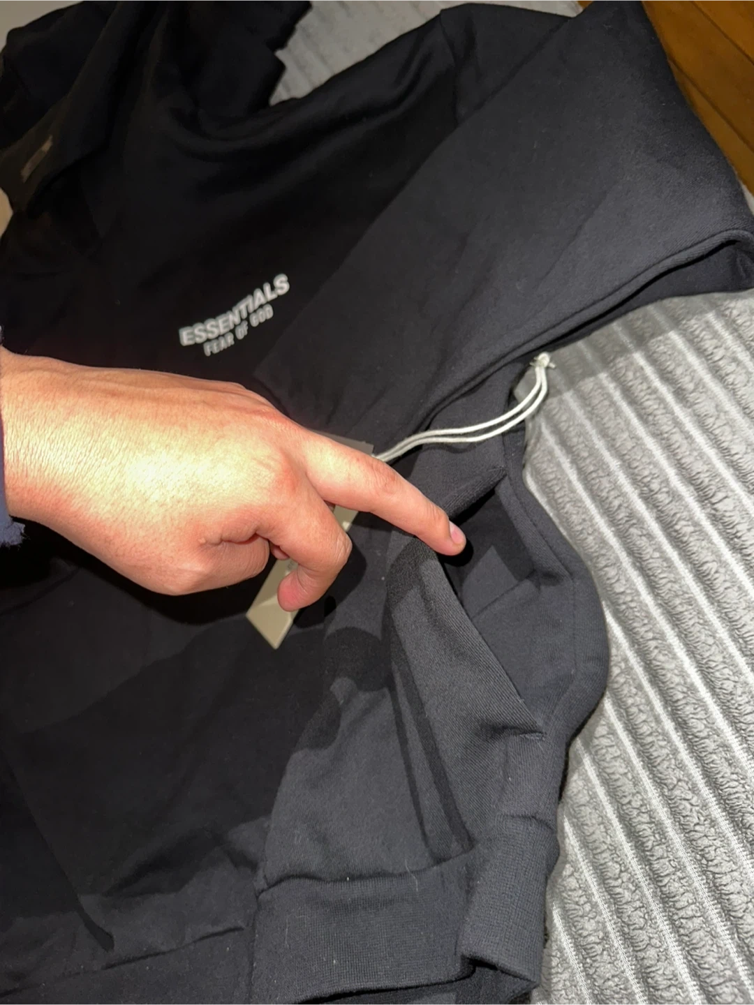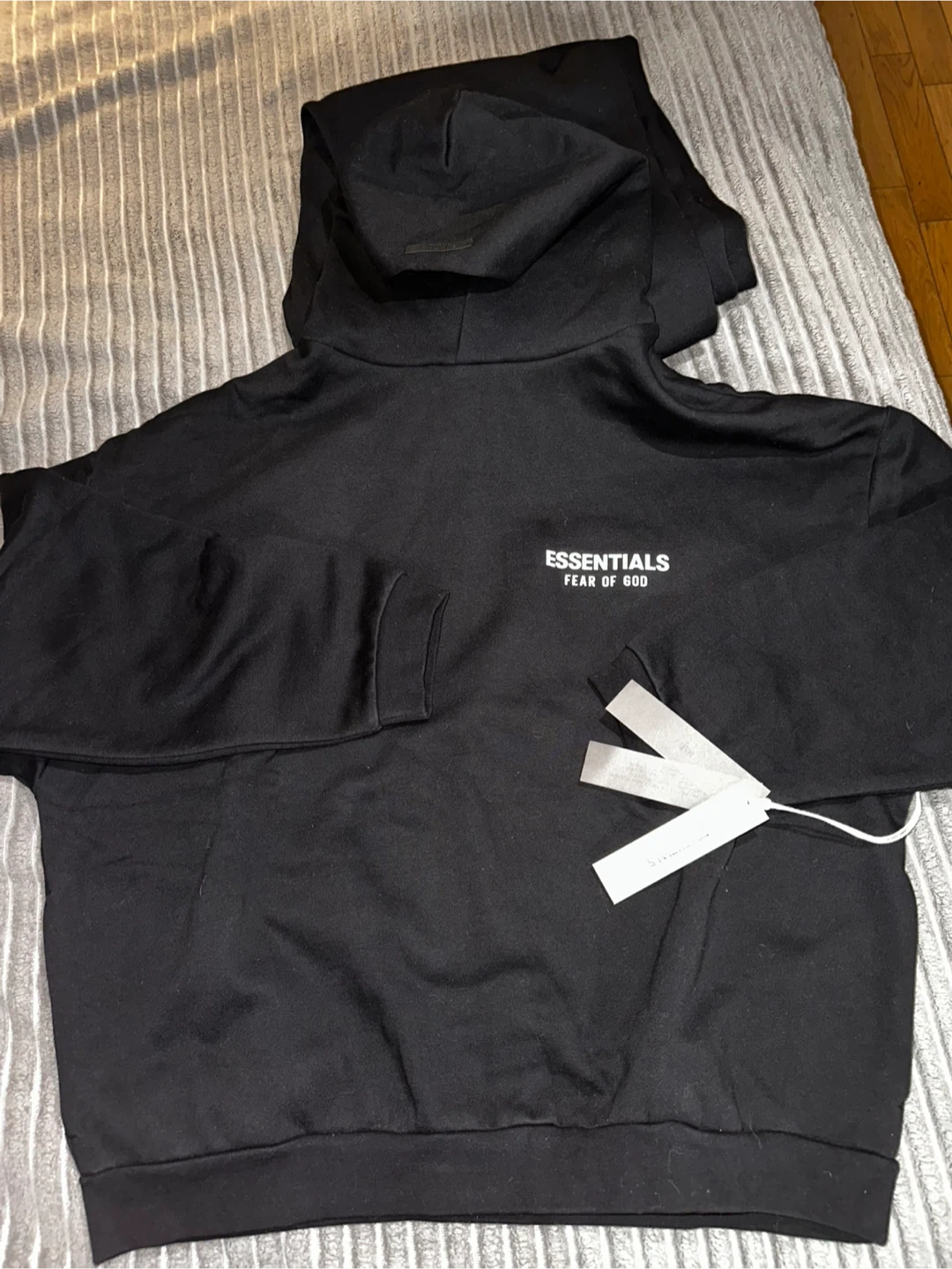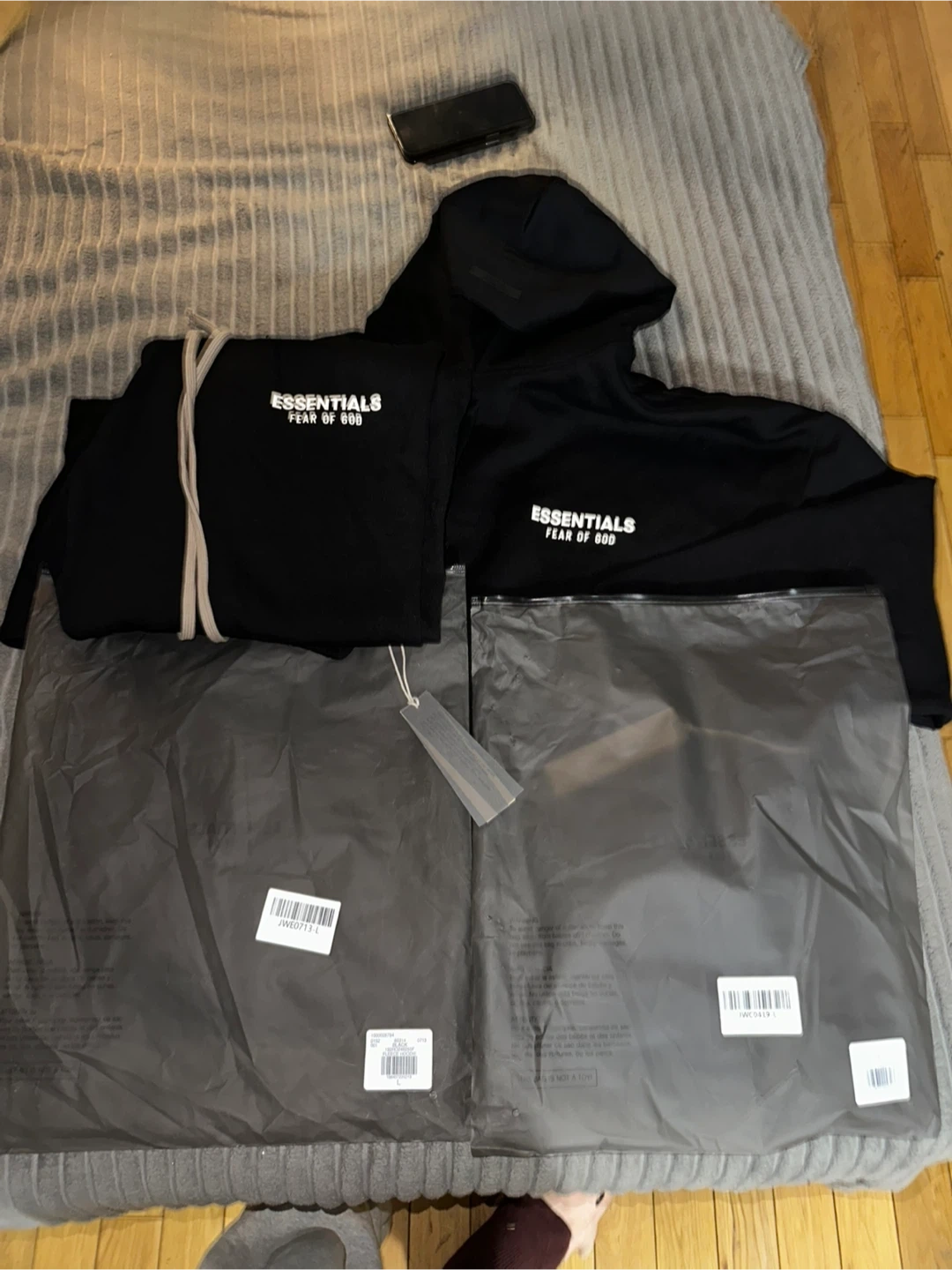 This set includes a black Essentials Fear of God hoodie and matching pants Both items are black and made of comfortable material. They're perfect for casual wear. Includes original packaging.