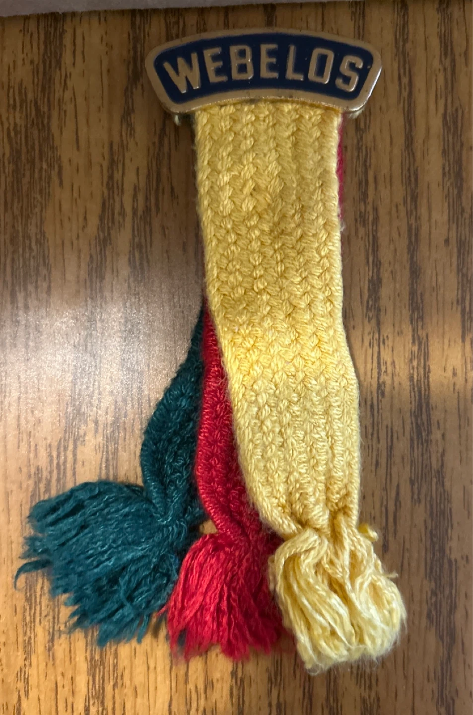 This is a Webelos badge with yellow, red, and teal streamers. It's a great item for collectors or anyone involved with scouting. The badge features a metal pin back.