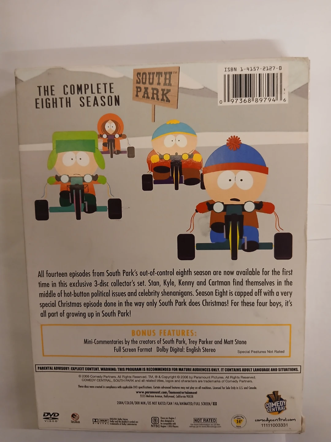 This is the complete eighth season of South Park on DVD. It's a 3-disc collector's set featuring all fourteen episodes from the season. Includes bonus features like mini-commentaries by the creators. Full screen format with Dolby Digital: English Stereo.