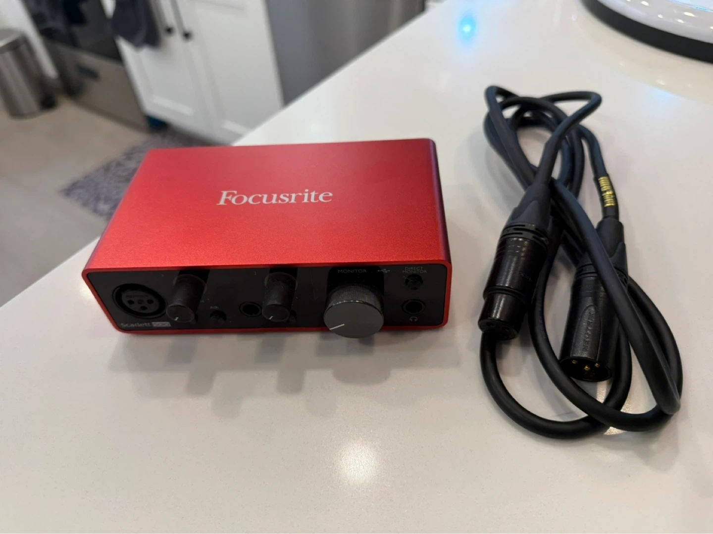Hardly used Focusrite Scarlett Solo 3rd Gen audio interface. It's a 2-in/2-out USB audio interface. Includes cable.