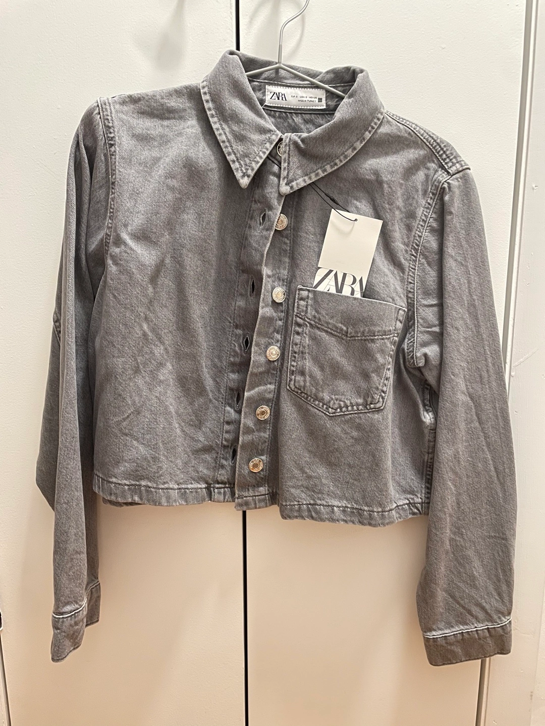 Cropped denim jacket. Gray wash. Long sleeves. Button closure. Chest pocket. Size small. Made in Turkey. Brand new with tags.