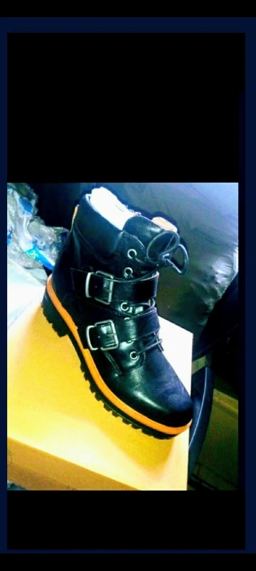 Selling a pair of black ankle boots. They feature a lace-up design with buckle straps and a lug sole.