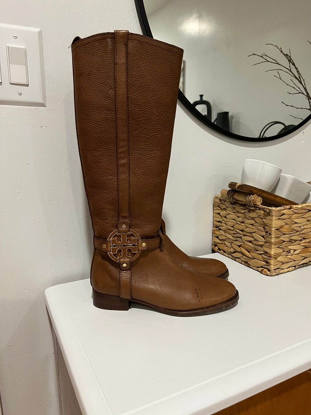 Brown leather riding boots with a gold Tory Burch logo detail. The boots are tall and have a low heel.