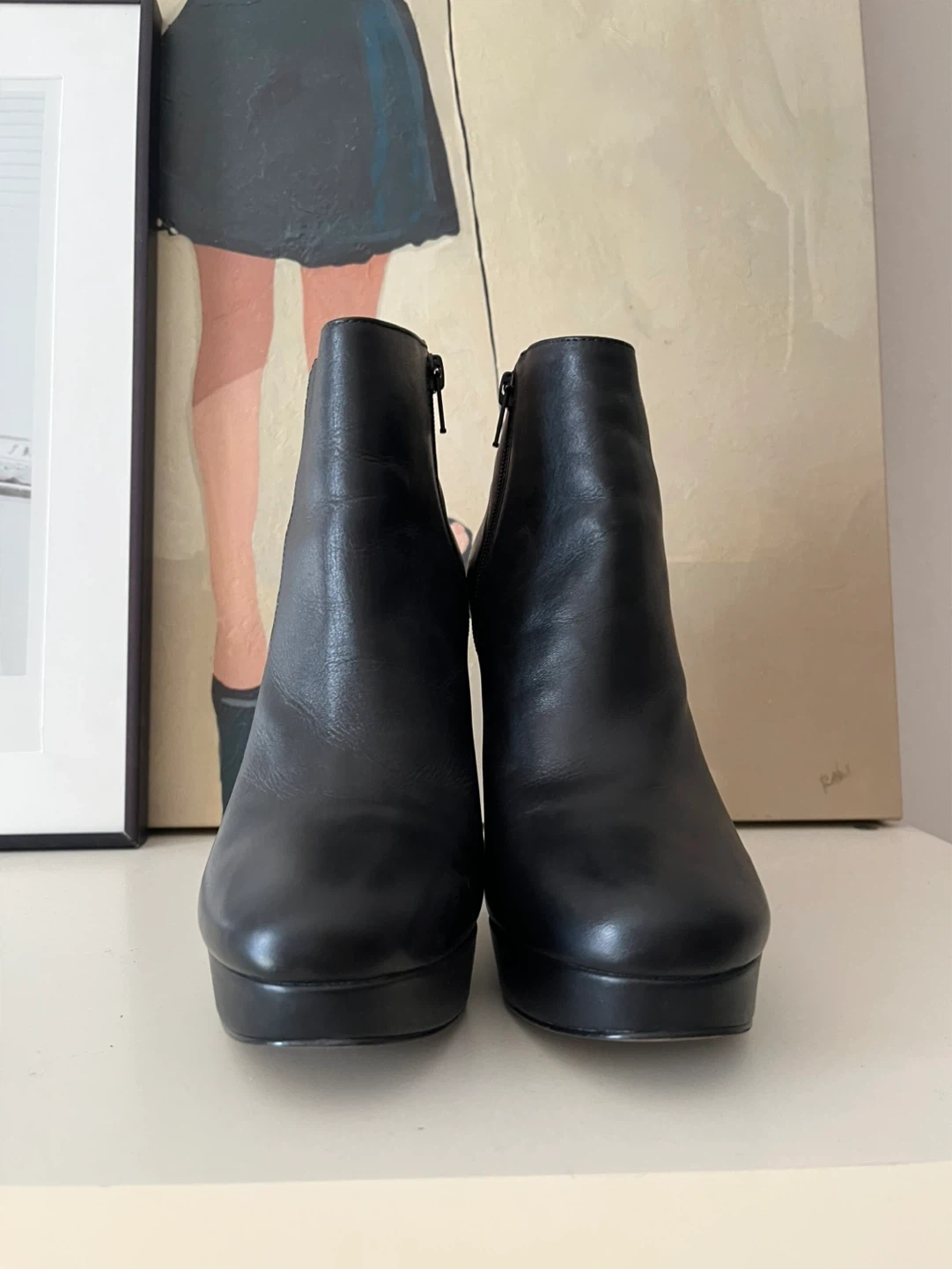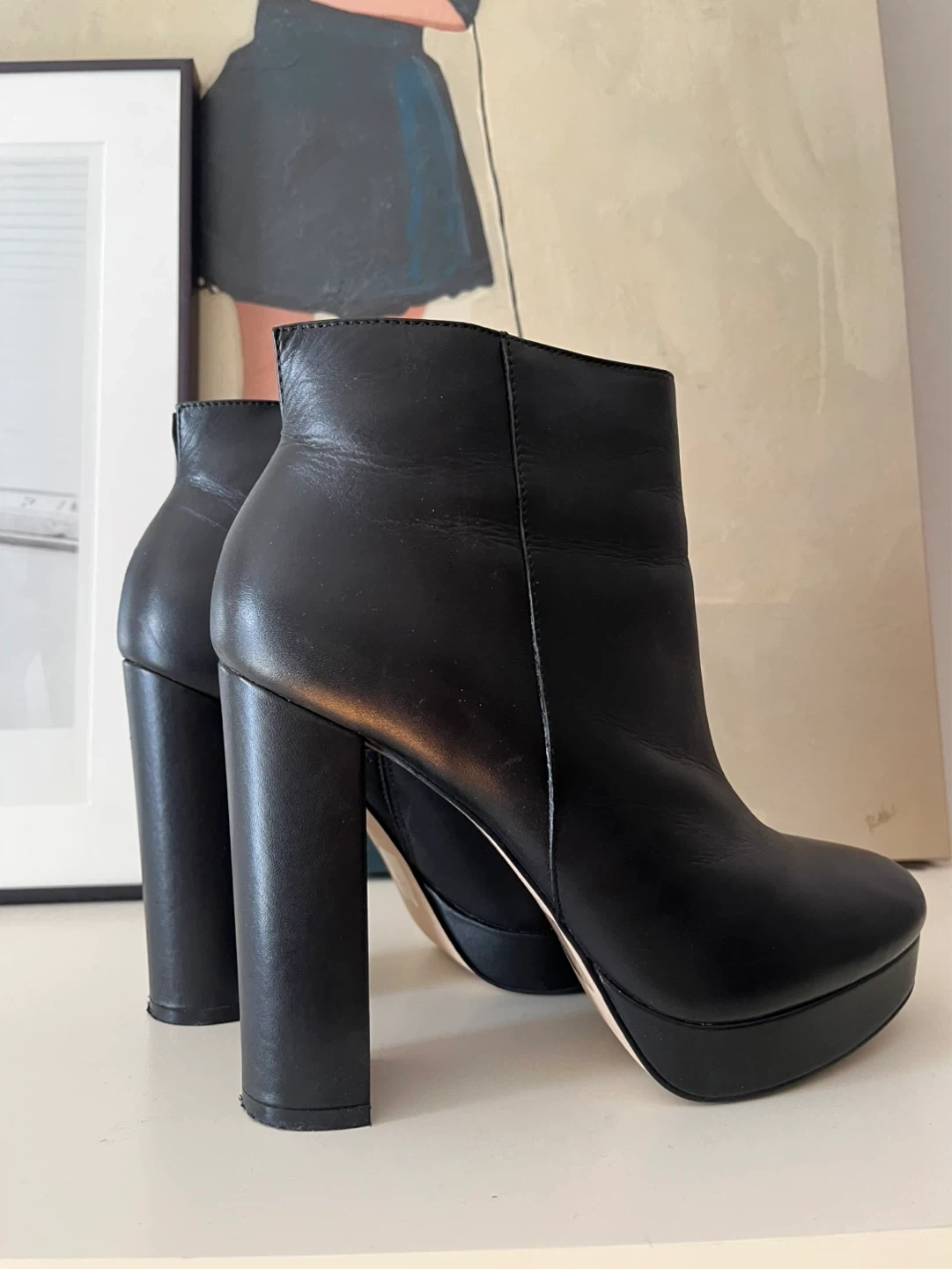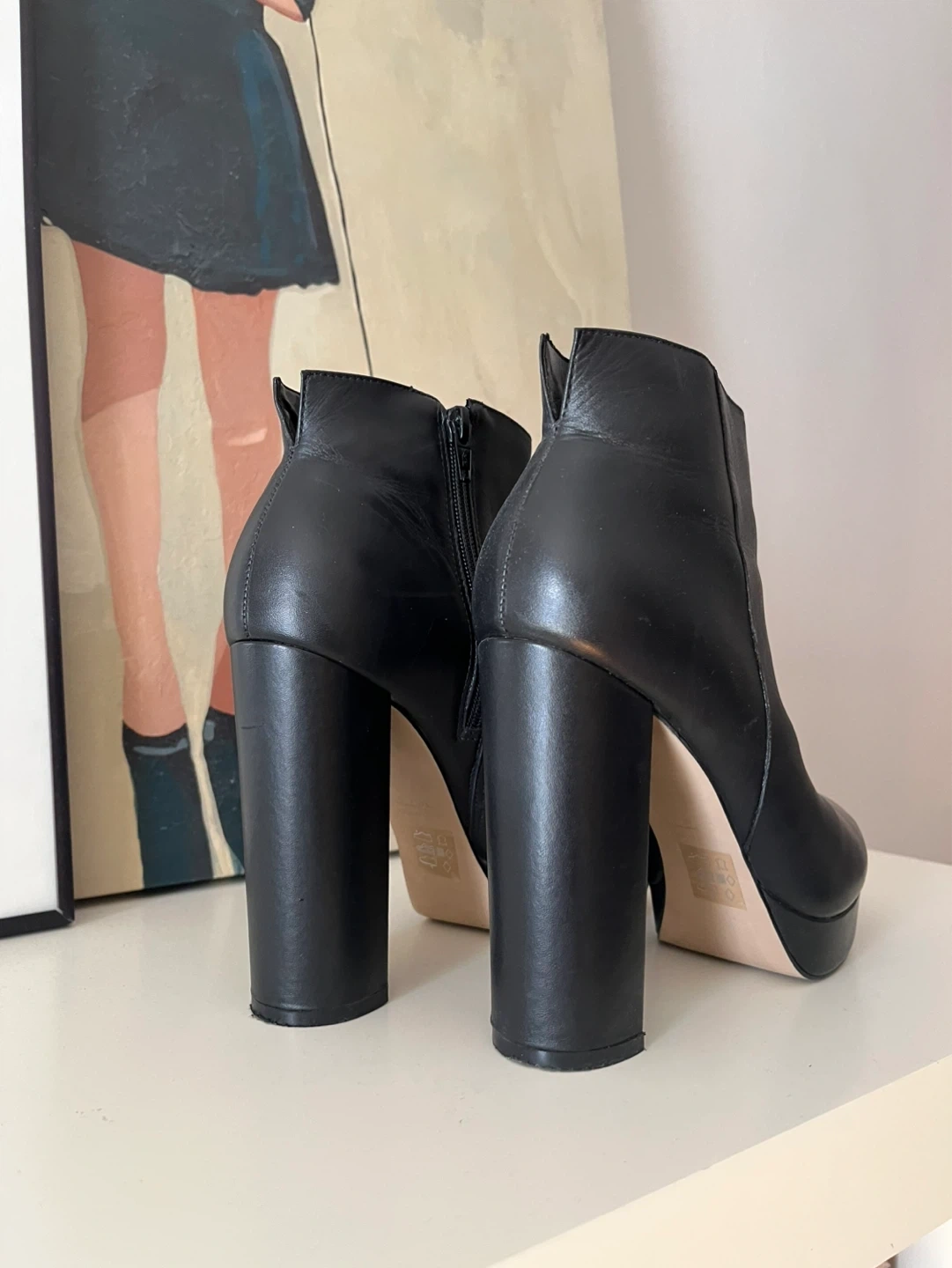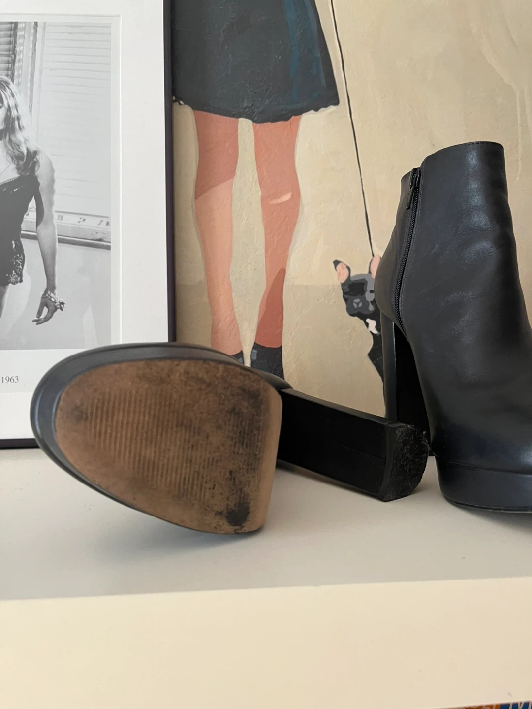 Chic black leather ankle boots with a sturdy platform and block heel. 4 1/2 inch heel. Very high! Features a convenient side zipper. These boots are made for expert high heel walkers. Worn only once. In great condition, only sign of wear on bottom of shoes.