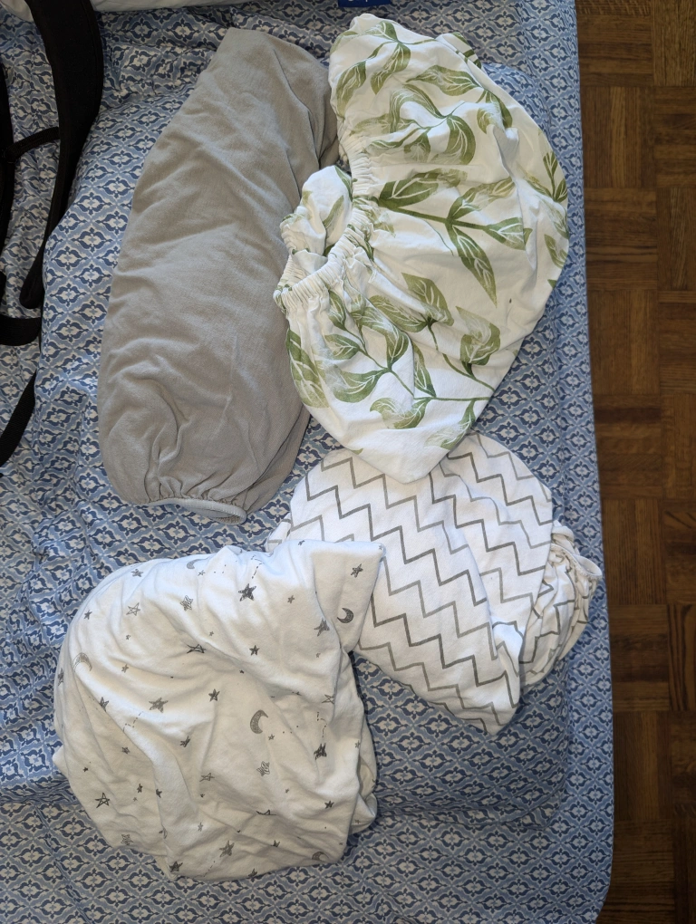 Offering a set of four fitted crib sheets, including three with charming patterns and one in a solid grey color. These sheets have been barely used, meticulously washed, and carefully stored. They are all in excellent condition, ready to provide comfort and style to your baby's crib.
