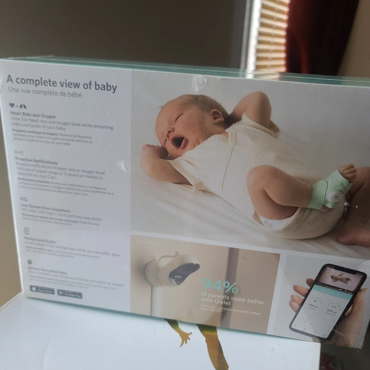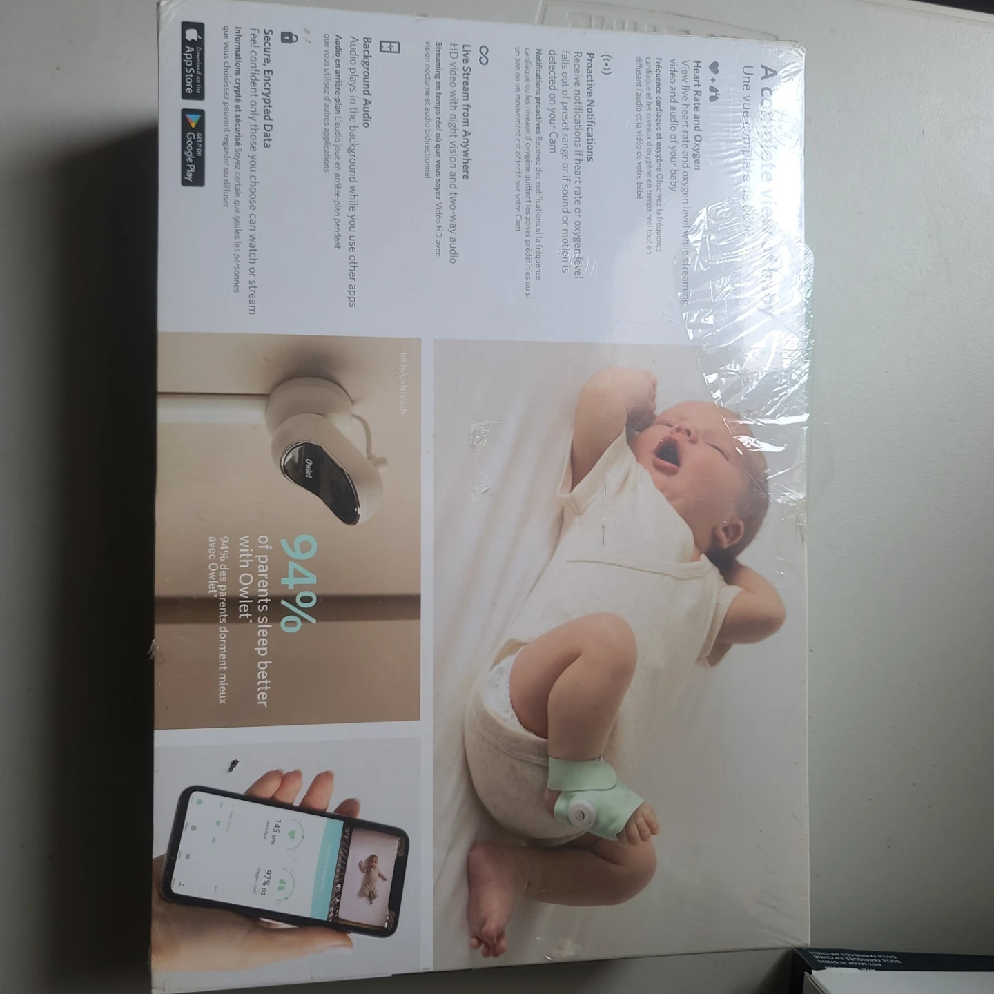 This Owlet Monitor Duo tracks heart rate, oxygen level, and room temperature. It includes a smart sock sensor, base station, and camera. The system provides proactive notifications and live streaming through its app.