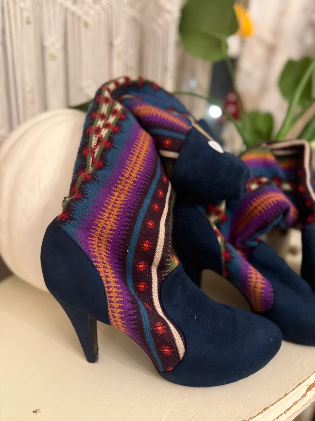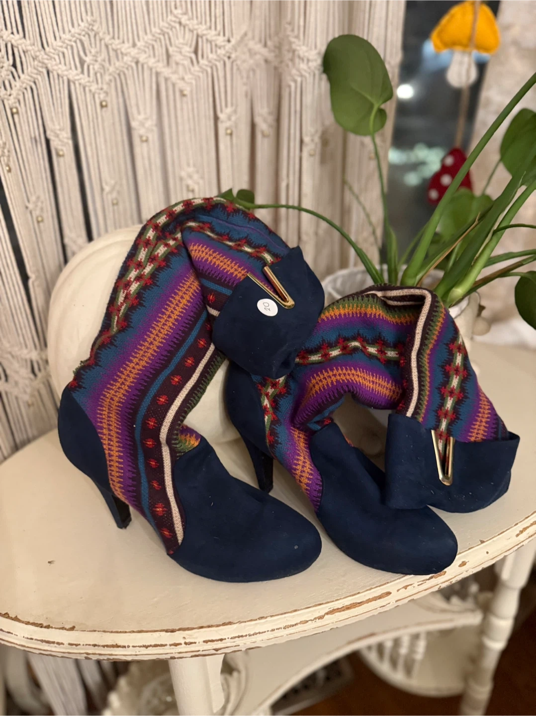 These multicoloured heeled boots are in great condition! They feature a unique patterned design and a comfortable heel height. Perfect for adding a pop of colour to any outfit!