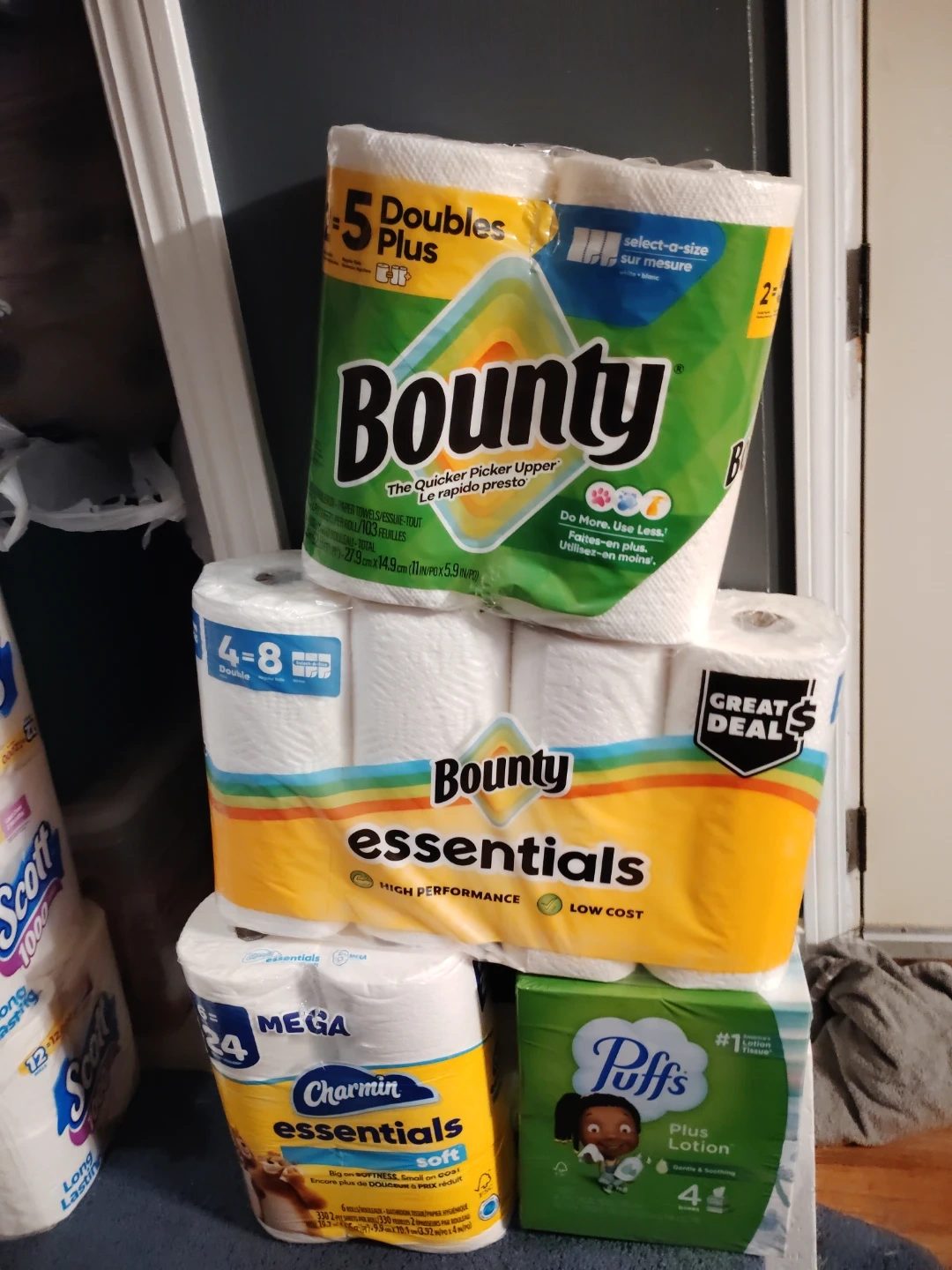 This lot includes Bounty Select-A-Size paper towels, Charmin Essentials Mega toilet paper, and Puffs Plus Lotion facial tissues. The Bounty paper towels are 5 Doubles Plus rolls. 4x20