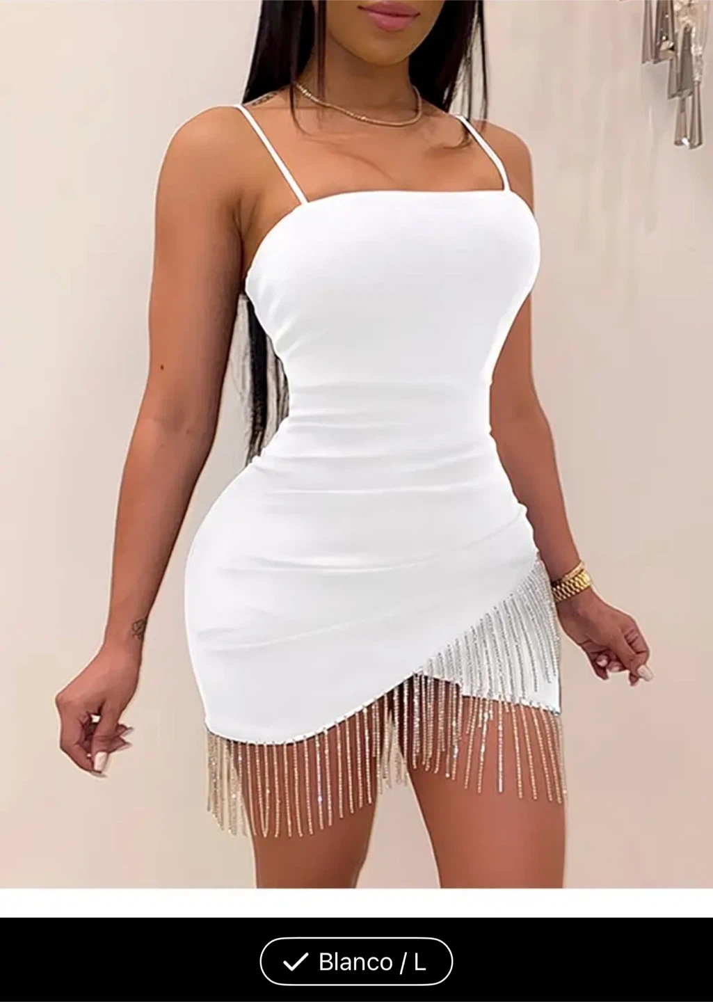 Sleek white mini dress with dazzling rhinestone fringe detailing along the hem. Spaghetti straps and a fitted silhouette.