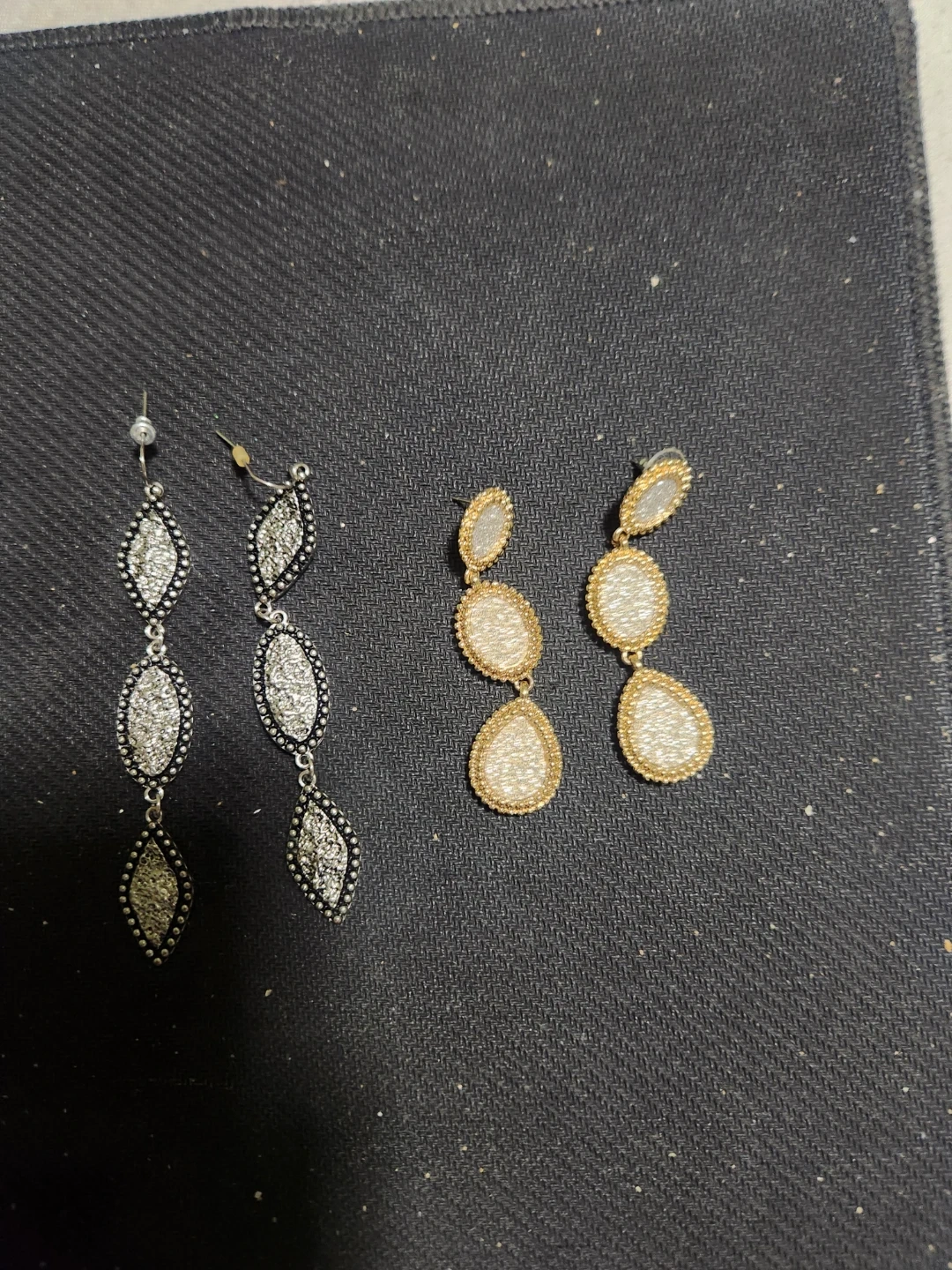 Two pairs of dangle earrings. One pair is silver-toned with diamond-shaped white stones. The other pair is gold-toned with oval-shaped white stones. These earrings are designed to add a touch of sparkle to any outfit!