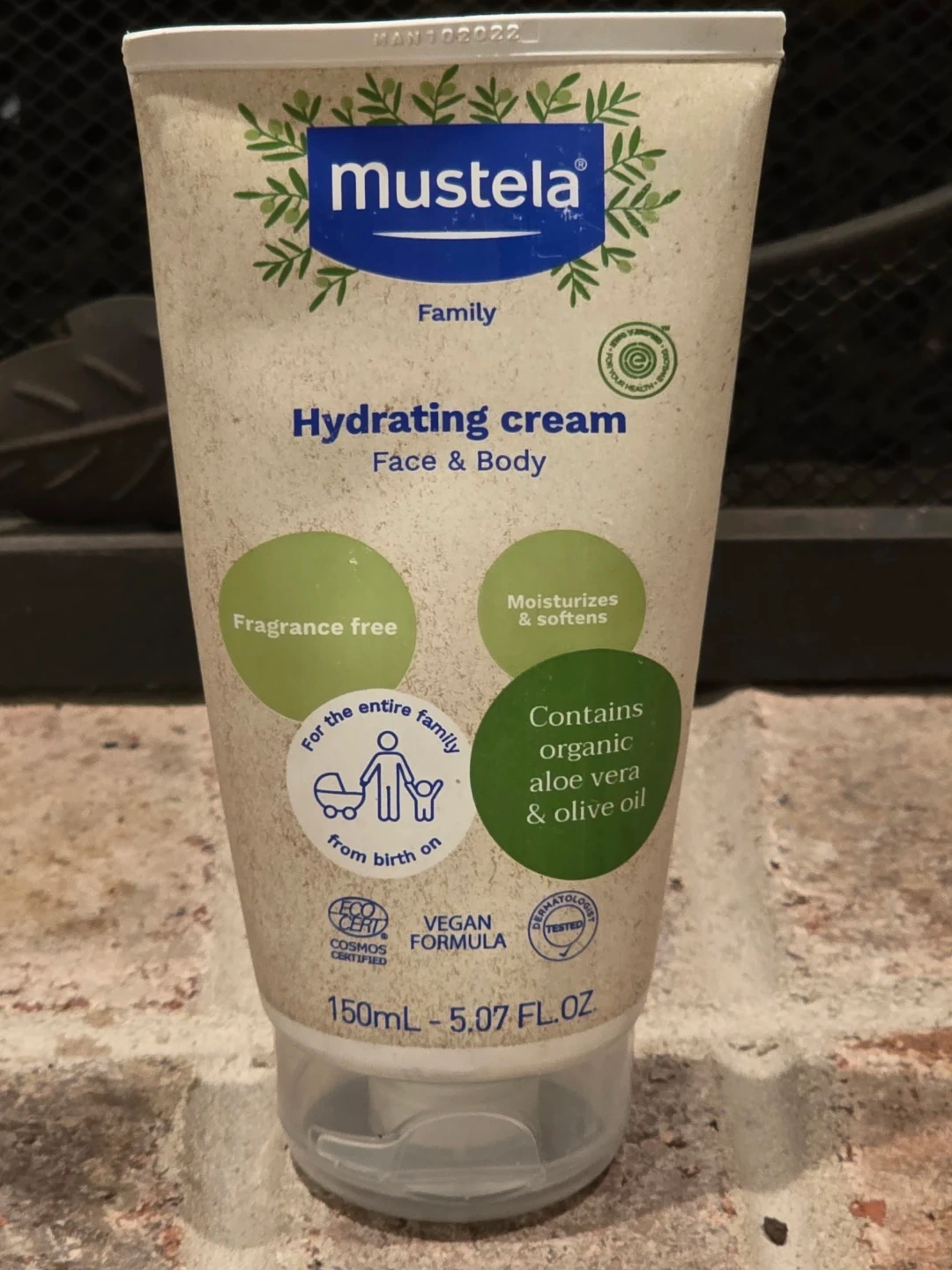 Mustela Family Hydrating Cream for face and body. Fragrance-free formula moisturizes and softens. Contains organic aloe vera & olive oil. It's for the entire family from birth on!