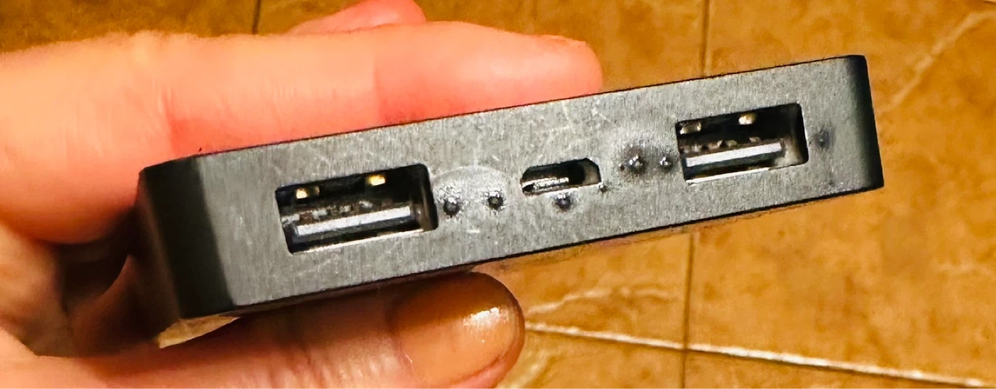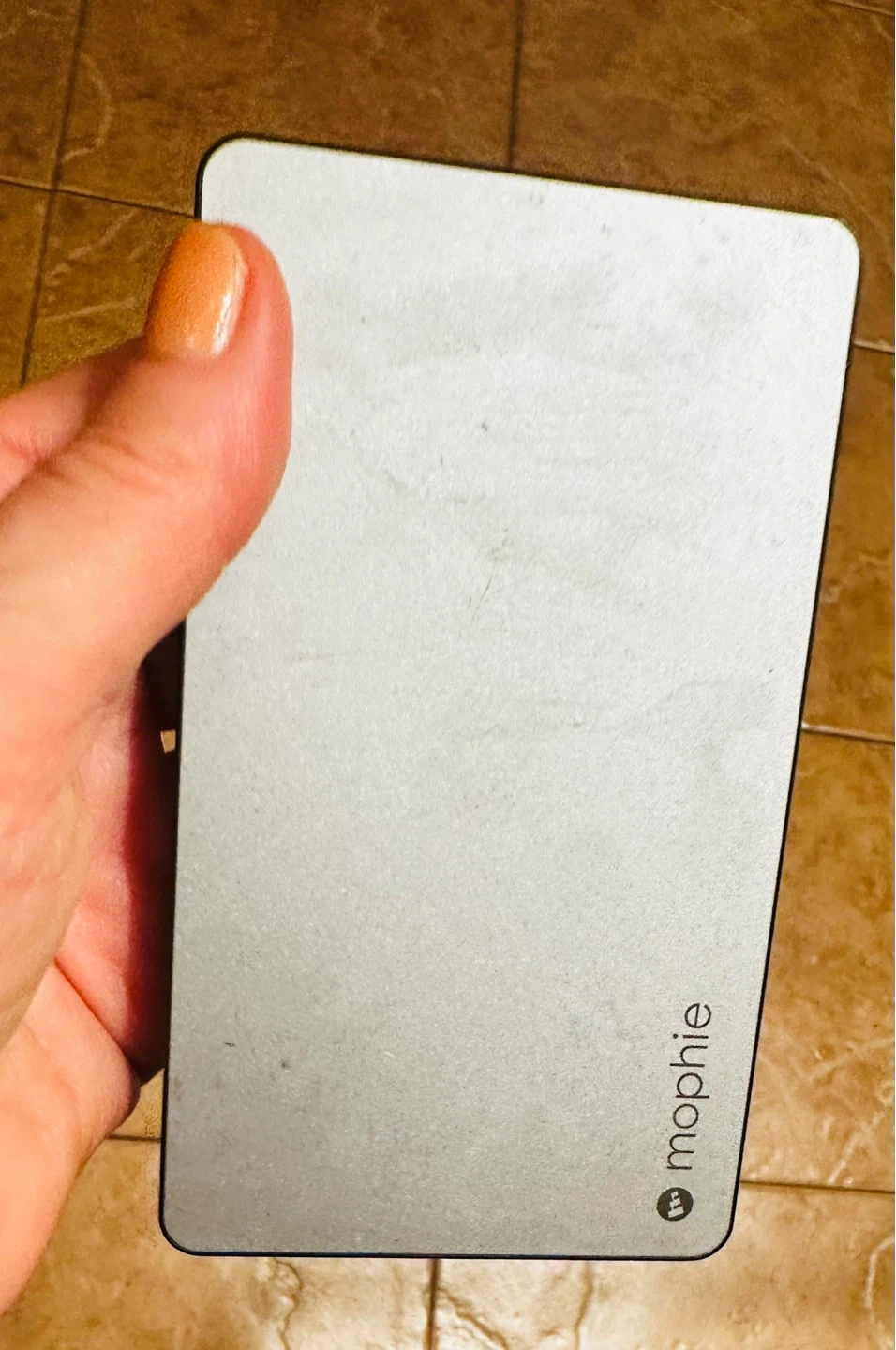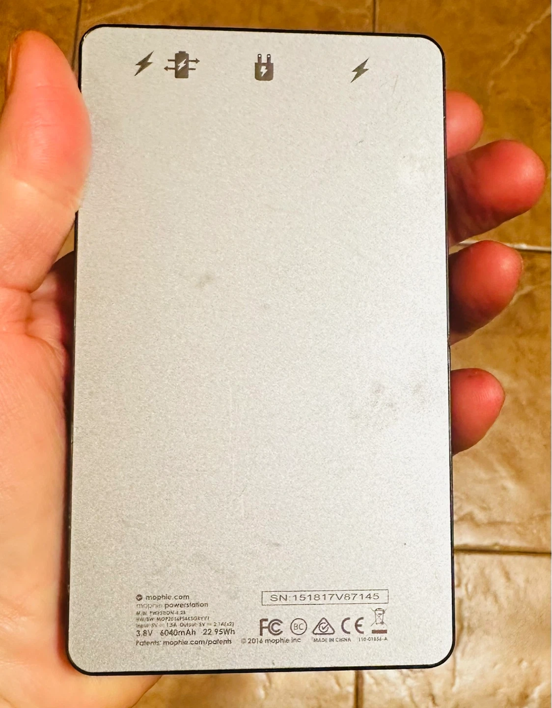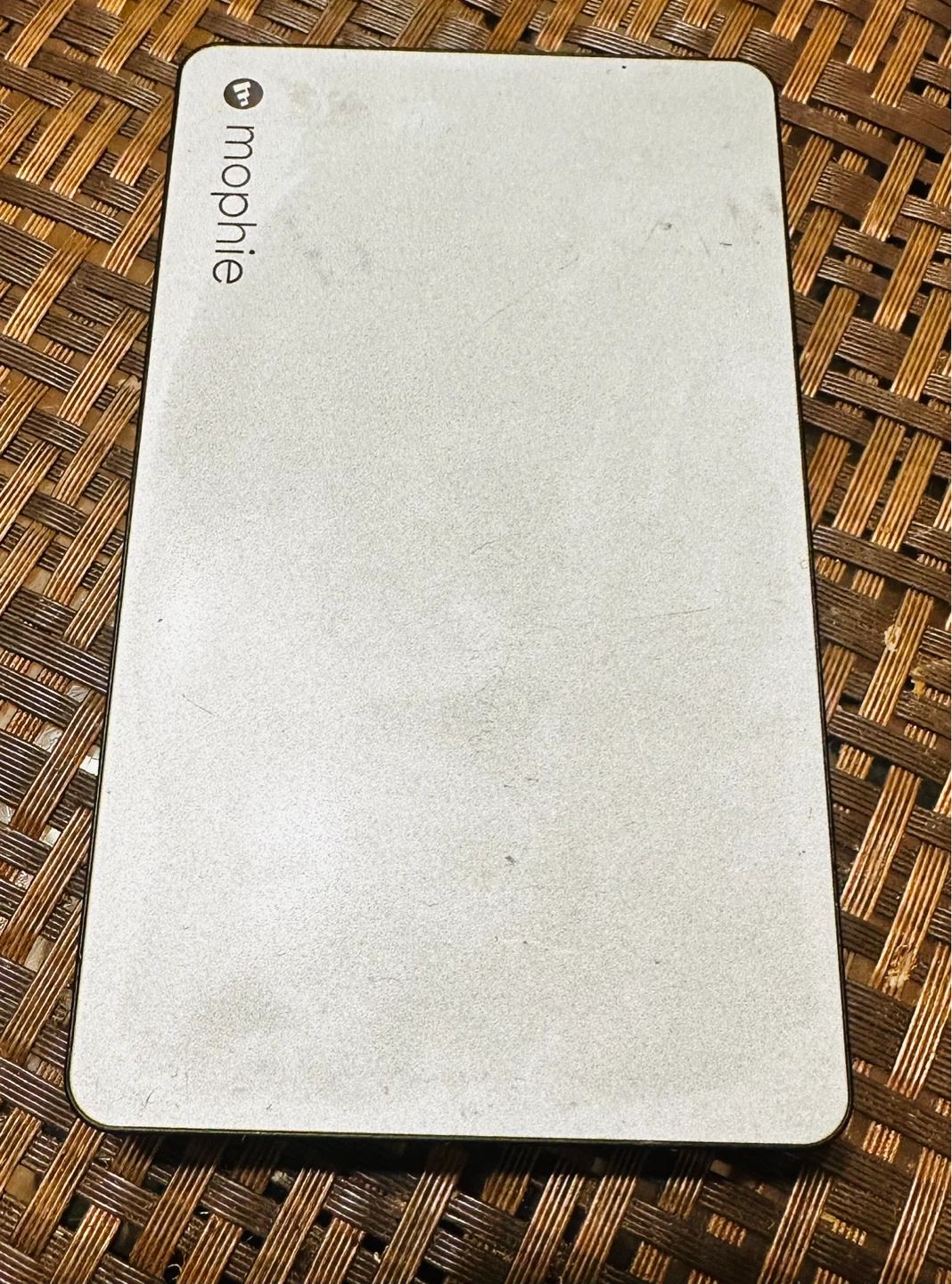 This Mophie Powerstation Plus XL portable charger is silver and has two USB-A ports and one micro-USB port. It's a 10,000mAh capacity power bank. It's great for keeping your devices charged on the go!