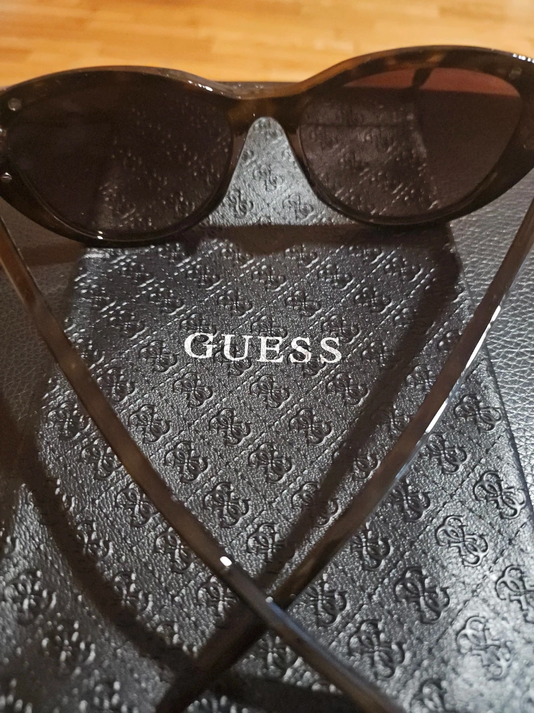 Stylish GUESS women's cat-eye sunglasses with tortoise shell frames. Features decorative rhinestones on the temples. Includes original GUESS case.