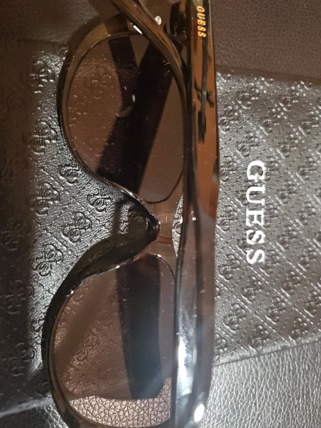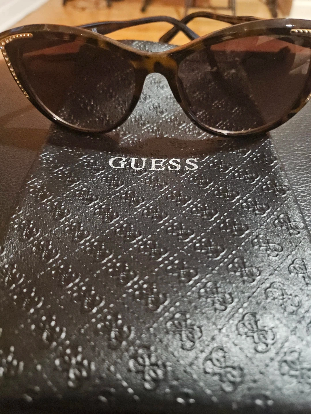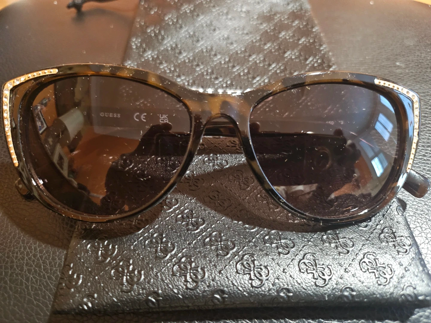 Stylish GUESS women's cat-eye sunglasses with tortoise shell frames. Features decorative rhinestones on the temples. Includes original GUESS case.