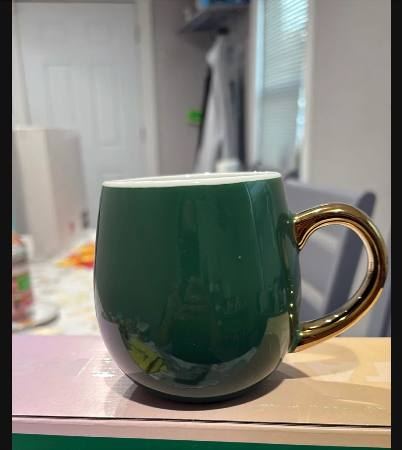 Selling a lovely green mug featuring a stylish gold handle. It's perfect for enjoying your favorite hot beverages in style! The mug is in great condition and ready for a new home