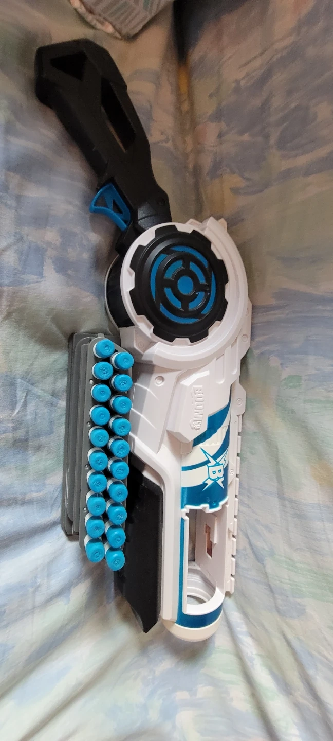 This is a BOOMco dart blaster. It includes a detachable magazine loaded with blue darts. Plastic construction. It's ready for some action!