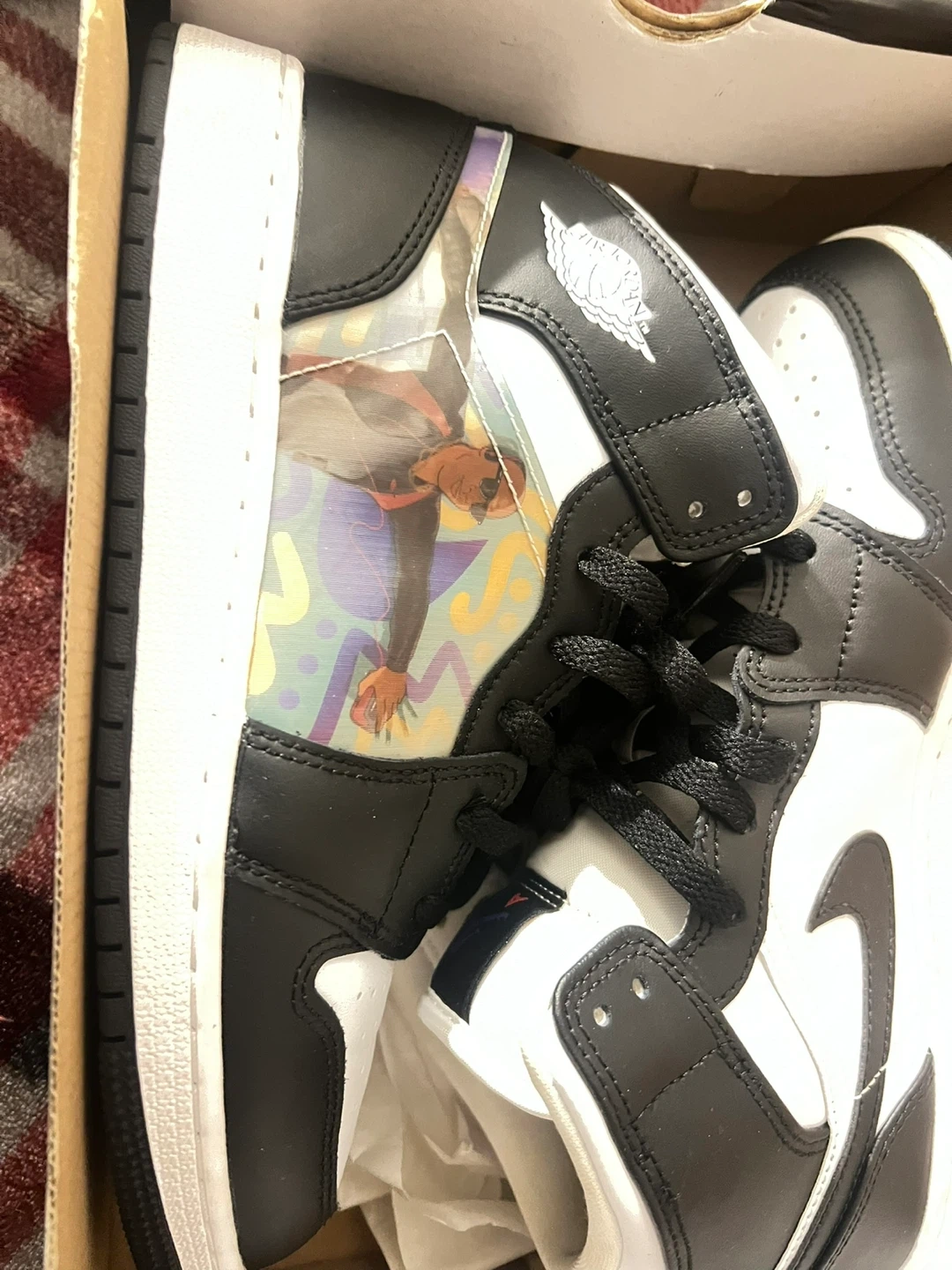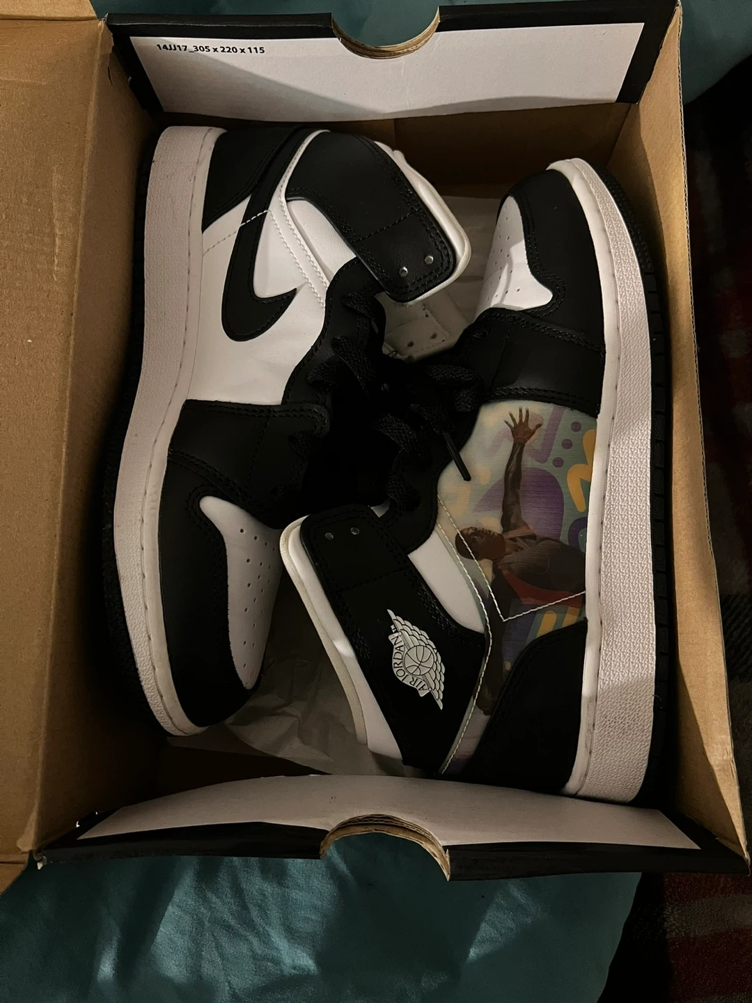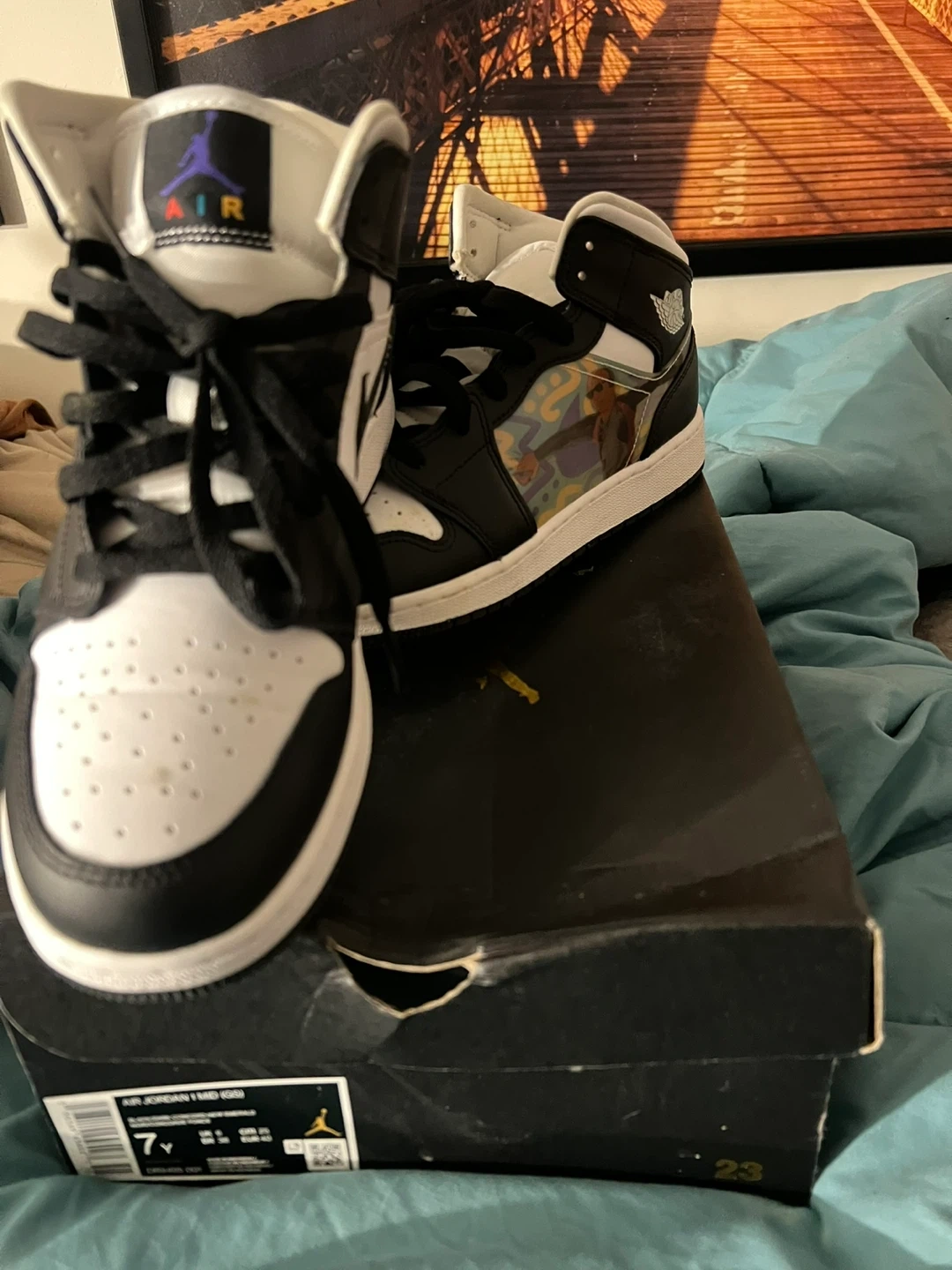 These Air Jordan 1 Mid SE sneakers feature a black and white colorway with unique graphic overlays. Comes with original box. Size 7Y.