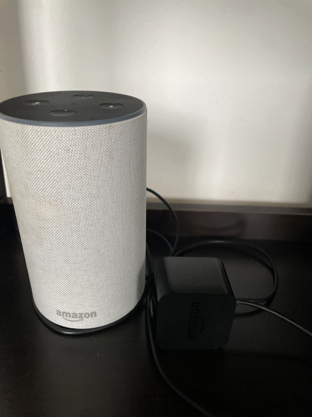 This is an Amazon Echo 2nd Generation smart speaker in Charcoal. It's a smart home device with voice control. Includes power adapter.