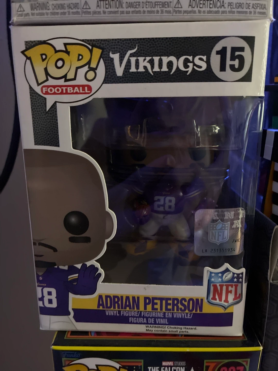 This is a Funko Pop! vinyl figure of Adrian Peterson, number 15, from the Vikings collection. It's part of the NFL series. Comes in its original packaging.