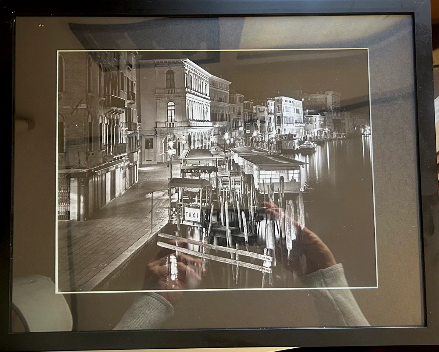 Five framed black and white photogravure prints of Venice, Italy. Various scenes including gondolas, canals, and architecture. $25 each or all five for $100. Frames are 11”x14”.
