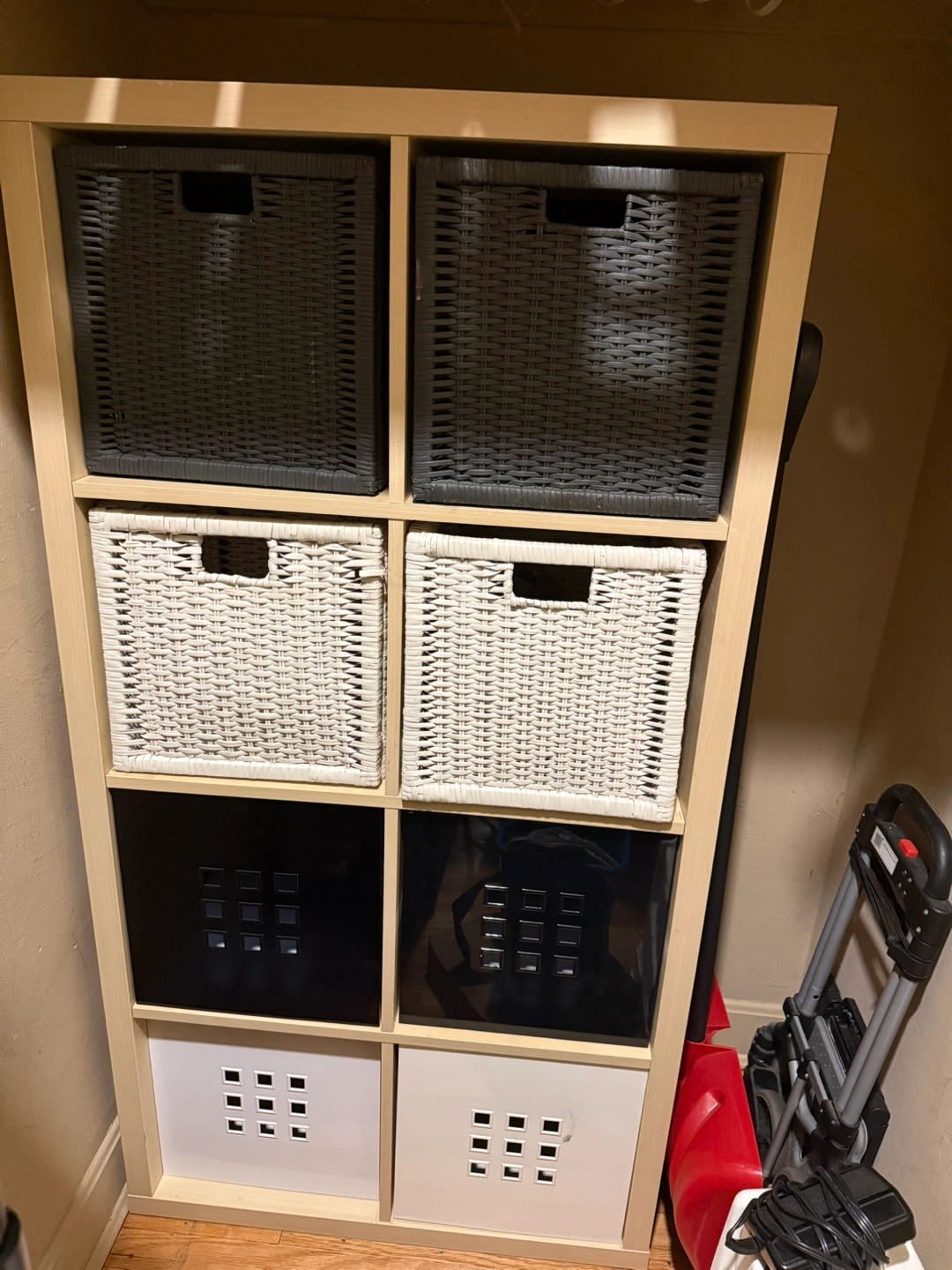 Moving sale, CASH ONLY! 8 (Eight)-cube shelving unit. Includes four woven baskets: two gray, two white. Also includes four black and two white insert boxes. Good condition.