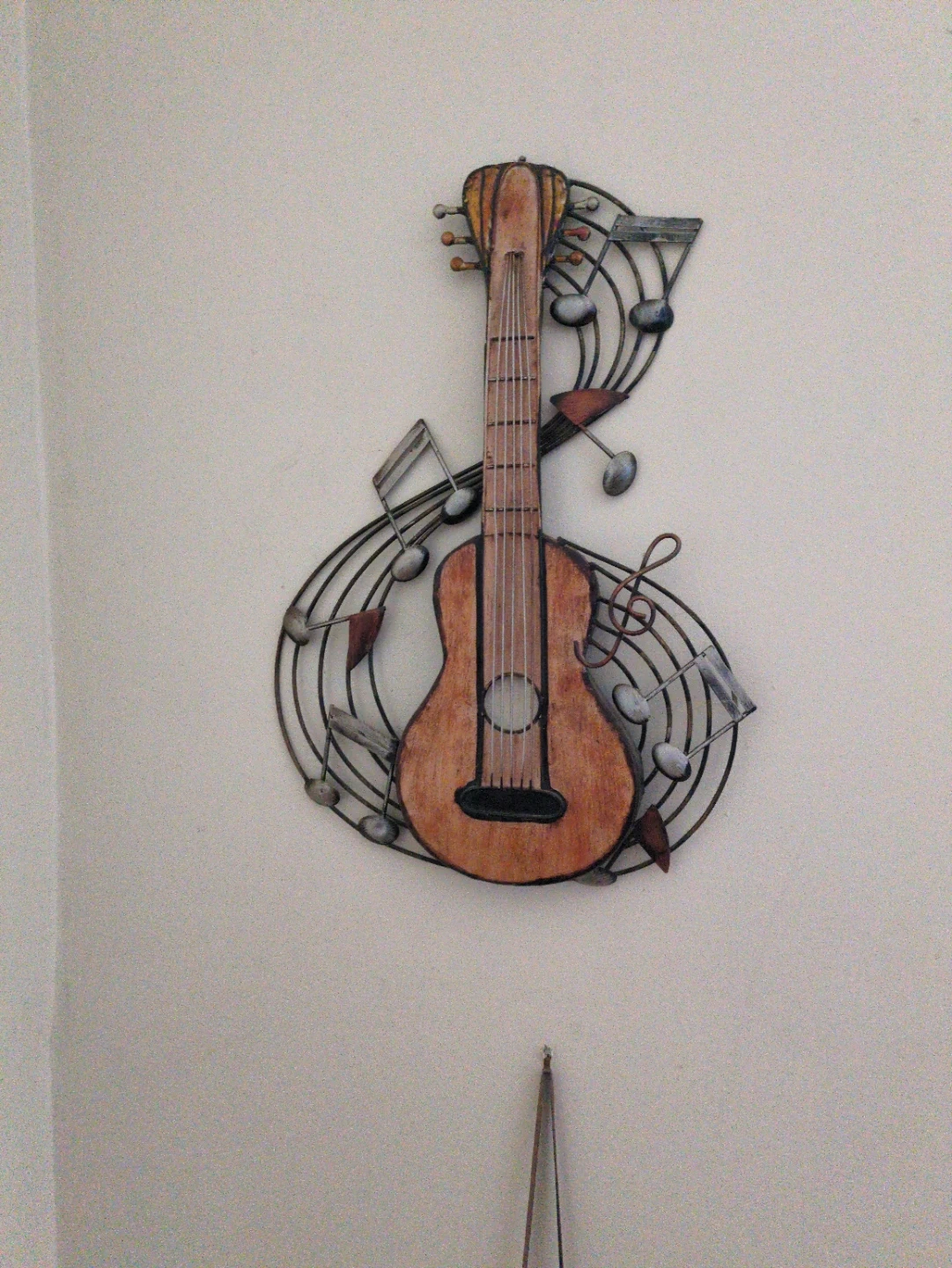 This wall decor features a guitar shape surrounded by musical notes. It's made of metal with a painted finish resembling wood. Great for adding a musical touch to any room!