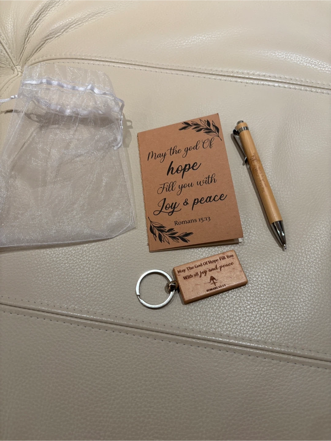 This is a lovely set that includes a wooden pen, a keychain, and a small notebook. The keychain and card both feature the message "May the God of hope fill you with all joy and peace. Romans 15:13". It comes in a small bag, perfect for gifting!
