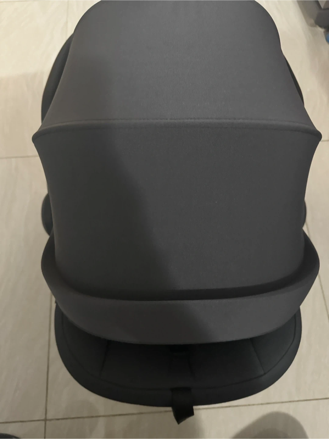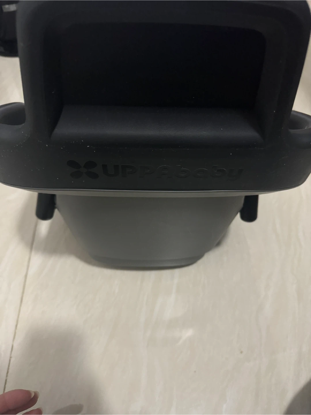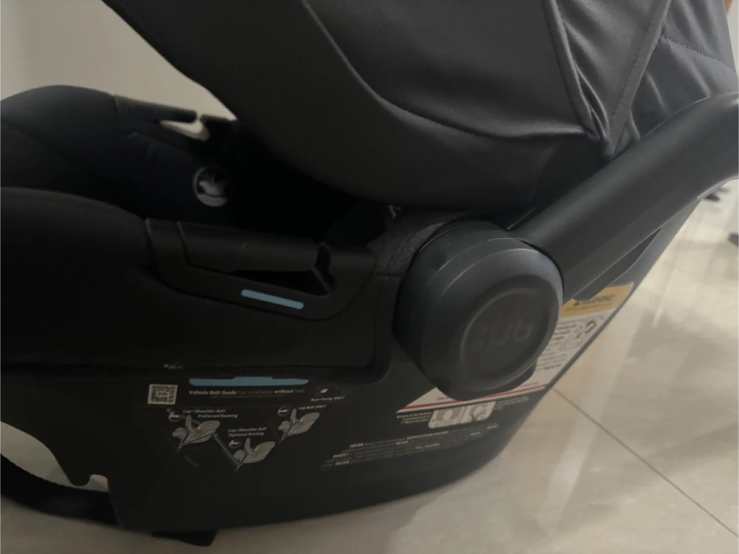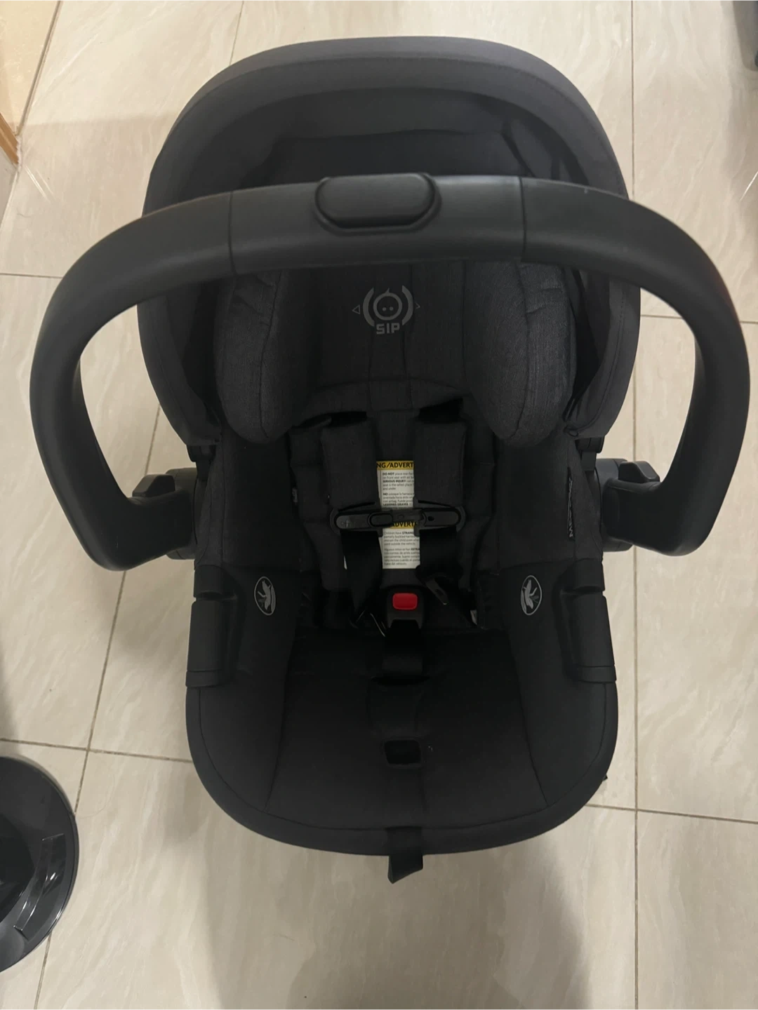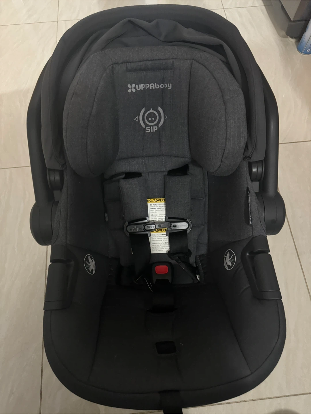 UPPAbaby infant car seat in charcoal. Features SIP (Side Impact Protection). Harness with adjustable straps. Comes with a canopy. Suitable for infants.