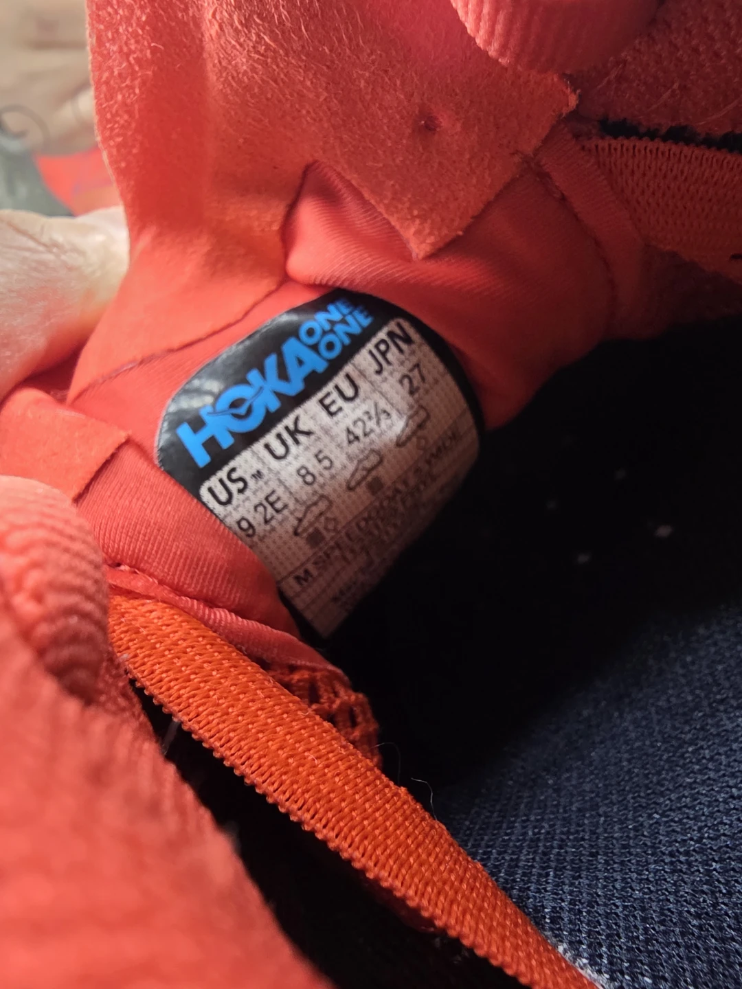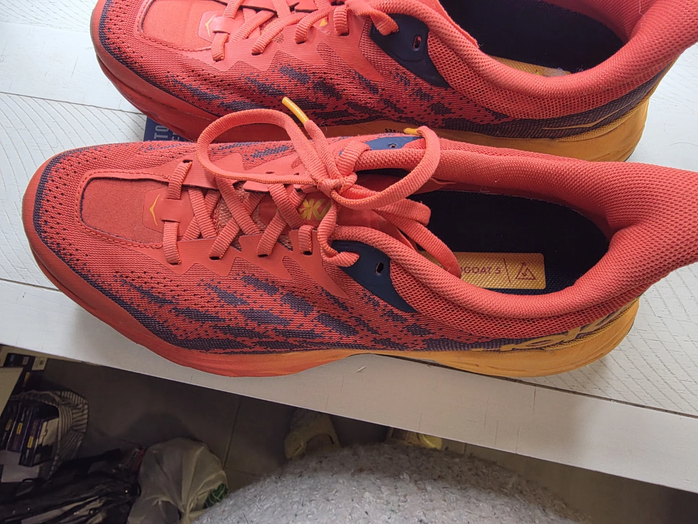 Hoka One One trail running shoes in red and orange. Vibram outsole for grip. Size 9.5 2E US Men's. I acquired these shoes while traveling, as I had forgotten my athletic footwear. I typically wear a women's size 10, and these are a men's size 9. They have been worn minimally and are in excellent condition. My reason for selling them is due to plantar fasciitis; they exacerbate my condition during running rather than providing relief.