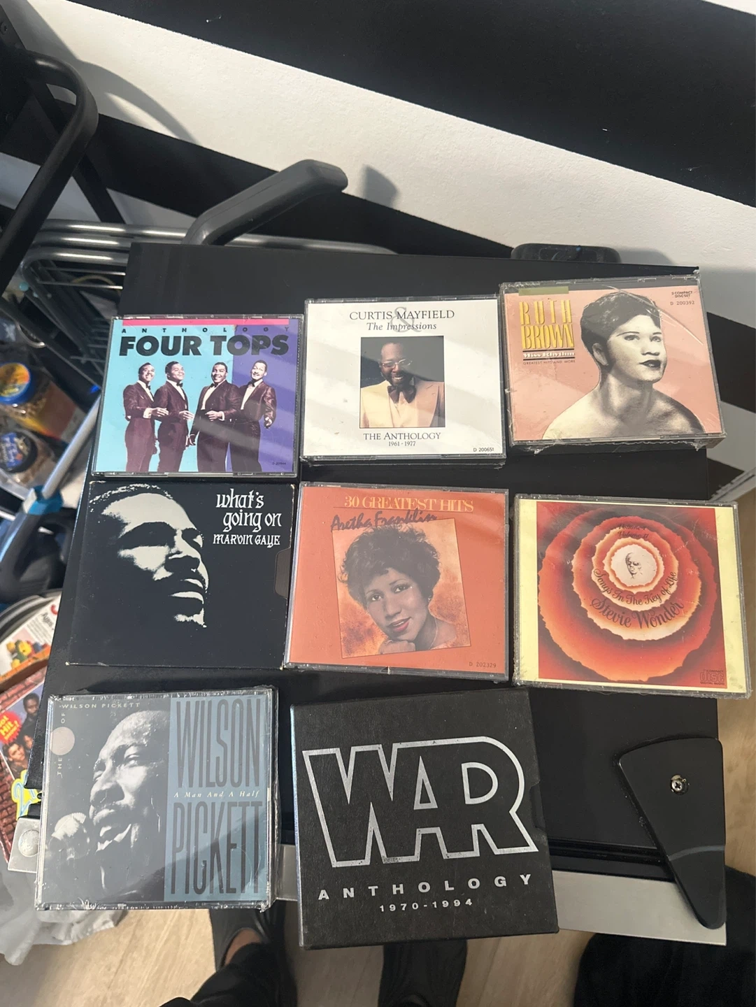 This collection includes CDs from Four Tops, Marvin Gaye, Aretha Franklin, Curtis Mayfield, Ruth Brown, Wilson Pickett, War, and Stevie Wonder. All CDs appear to be in their original jewel cases. It's a great selection for any soul or funk music enthusiast!
