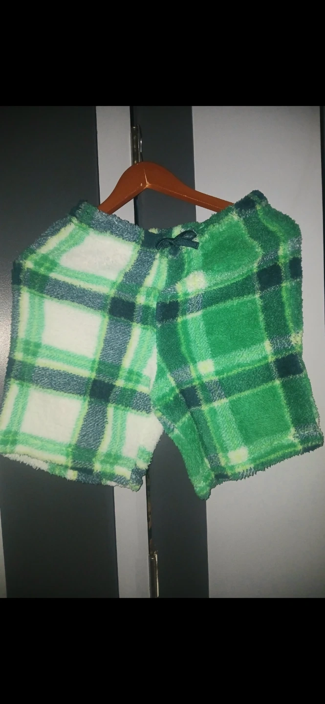 Cozy fuzzy lounge shorts in a green plaid pattern. Features a drawstring waist for adjustable comfort. Perfect for relaxing at home!