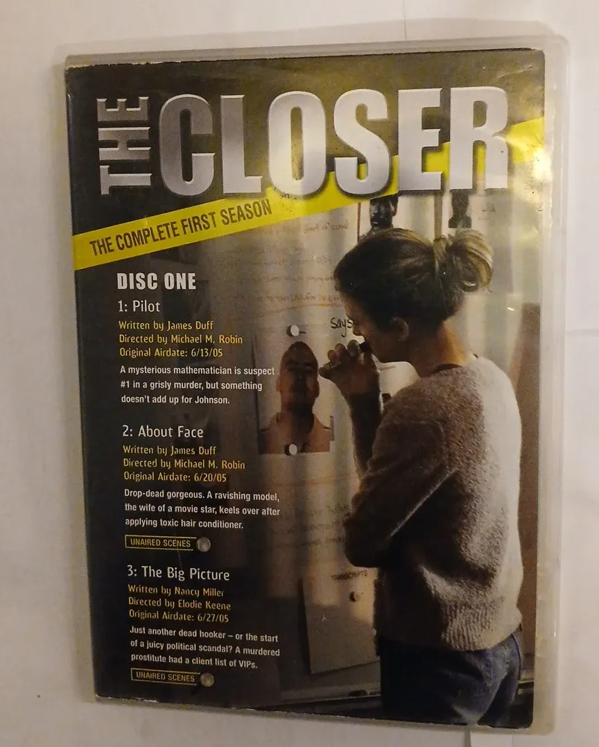 This is the complete first season of The Closer on DVD, disc one. Includes episodes Pilot, About Face, and The Big Picture. Originally aired in 2005. Air dates are 6/13/05, 6/20/05, and 6/27/05.