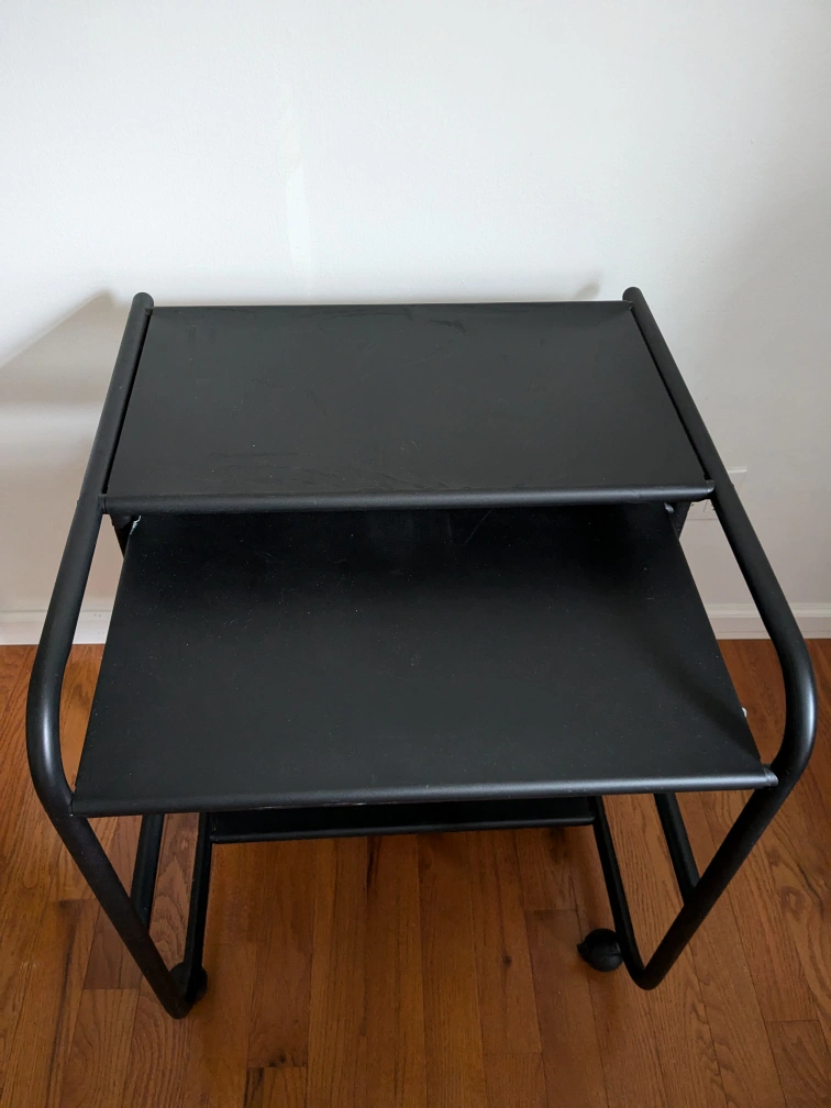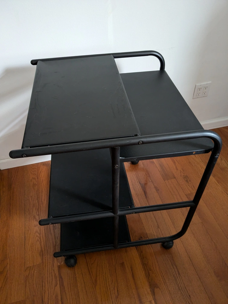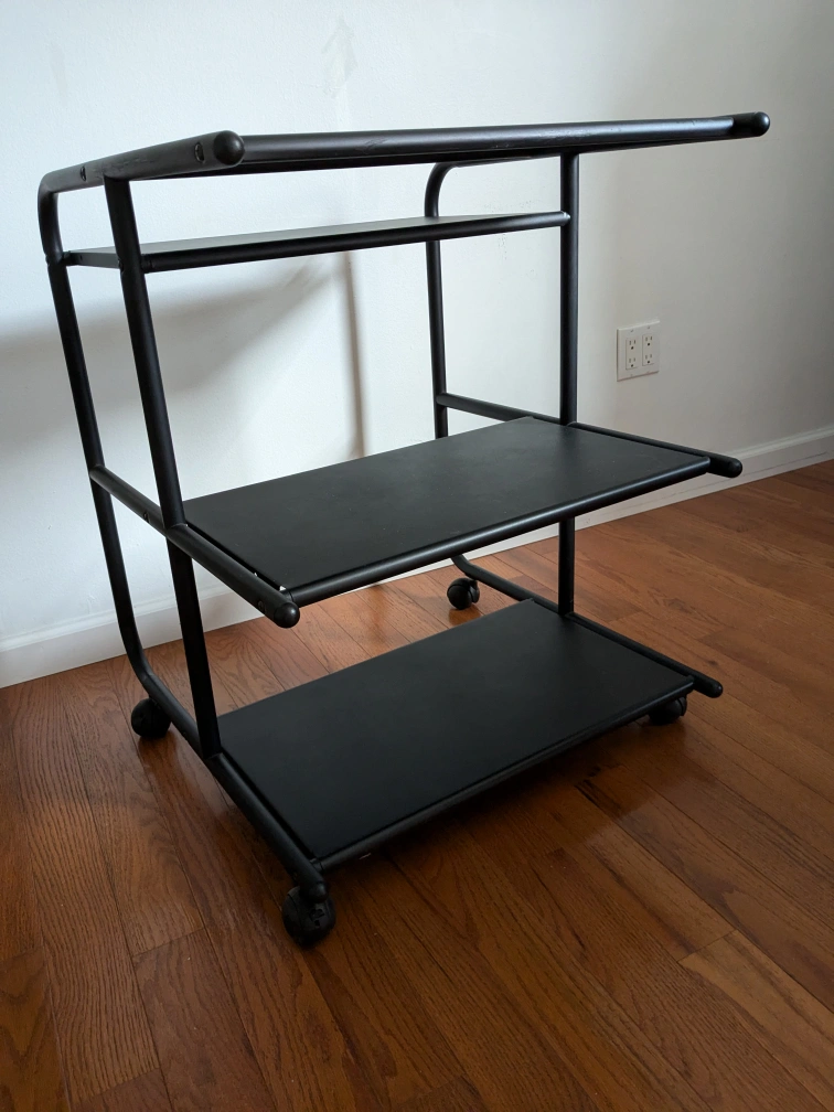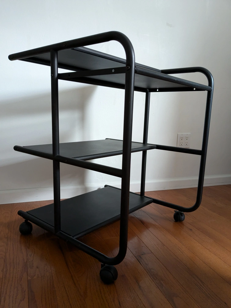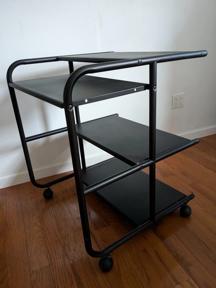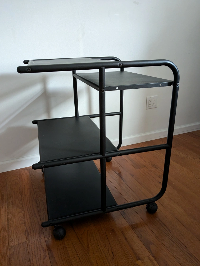 This black metal cart has 3 shelves and rolling wheels. It's ideal and sturdy for a computer desk. It is a great addition to any home as well