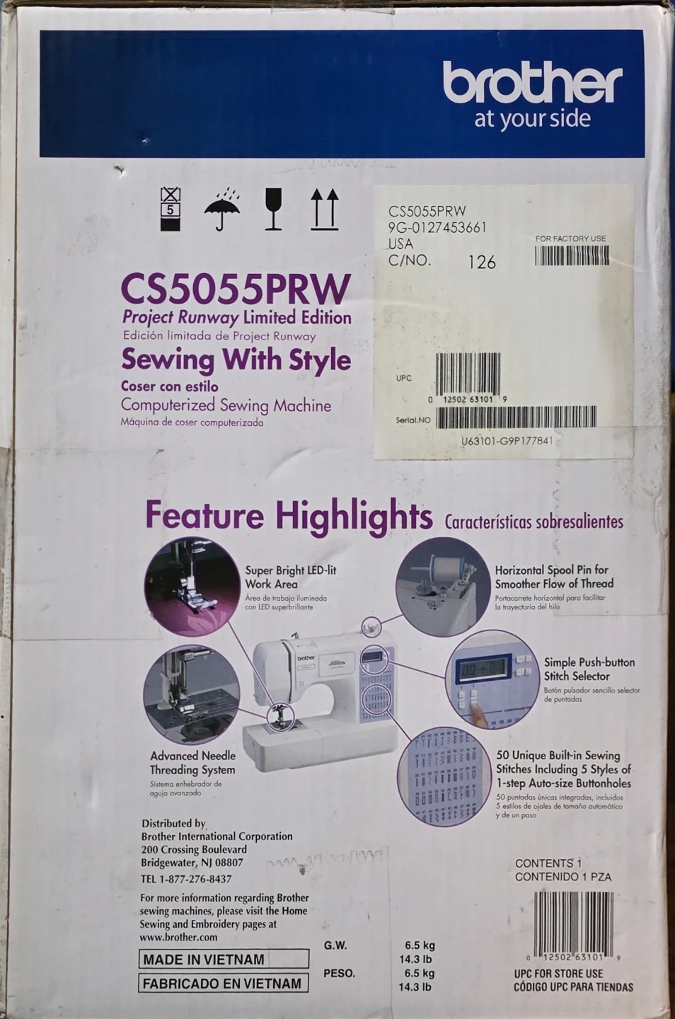 Selling a Brother CS5055PRW Project Runway Limited Edition sewing machine! It's in excellent condition and comes with the original box. This computerized sewing machine offers a variety of features for all your sewing needs, including 50 unique built-in stitches and an advanced needle threading system. The super bright LED-lit work area makes sewing a breeze!