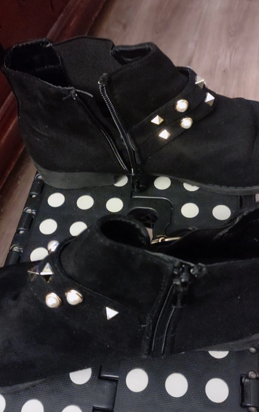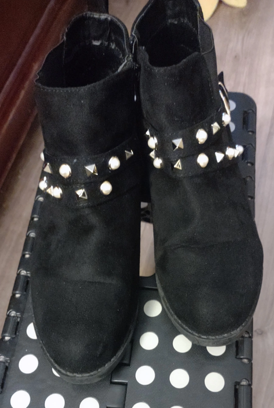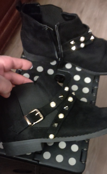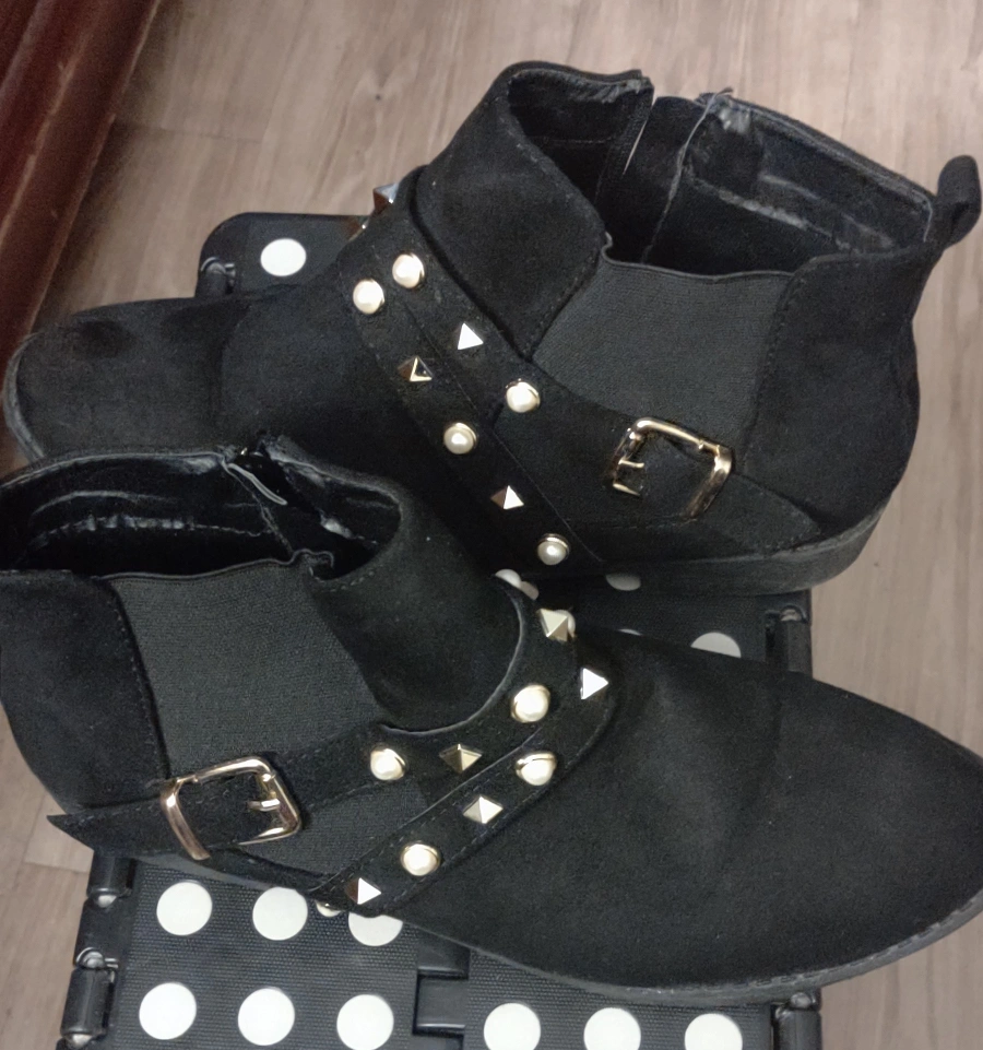 The boots have gold studs and pearls on the straps. The boots are in good condition and have been worn a few times. Size 10