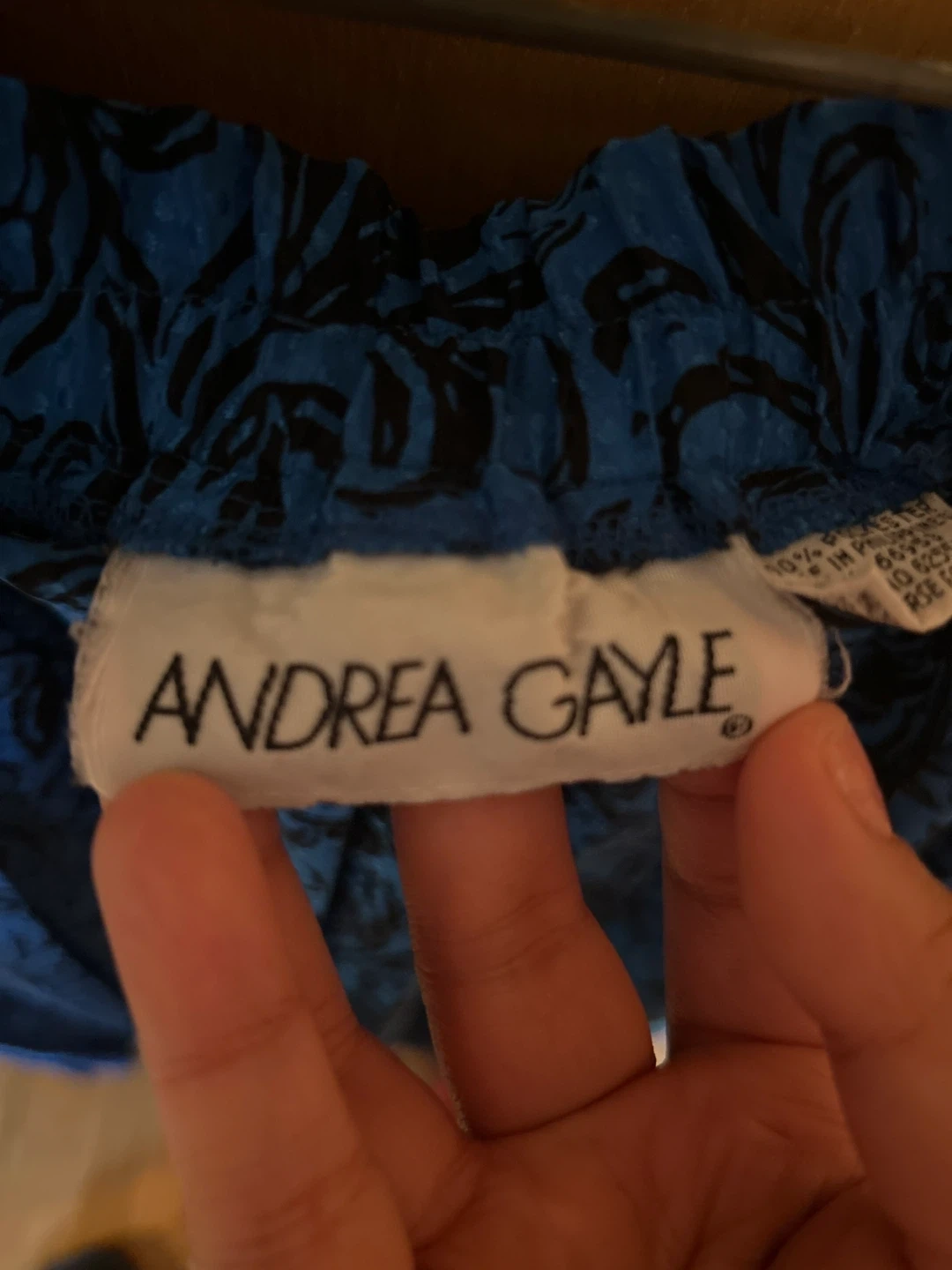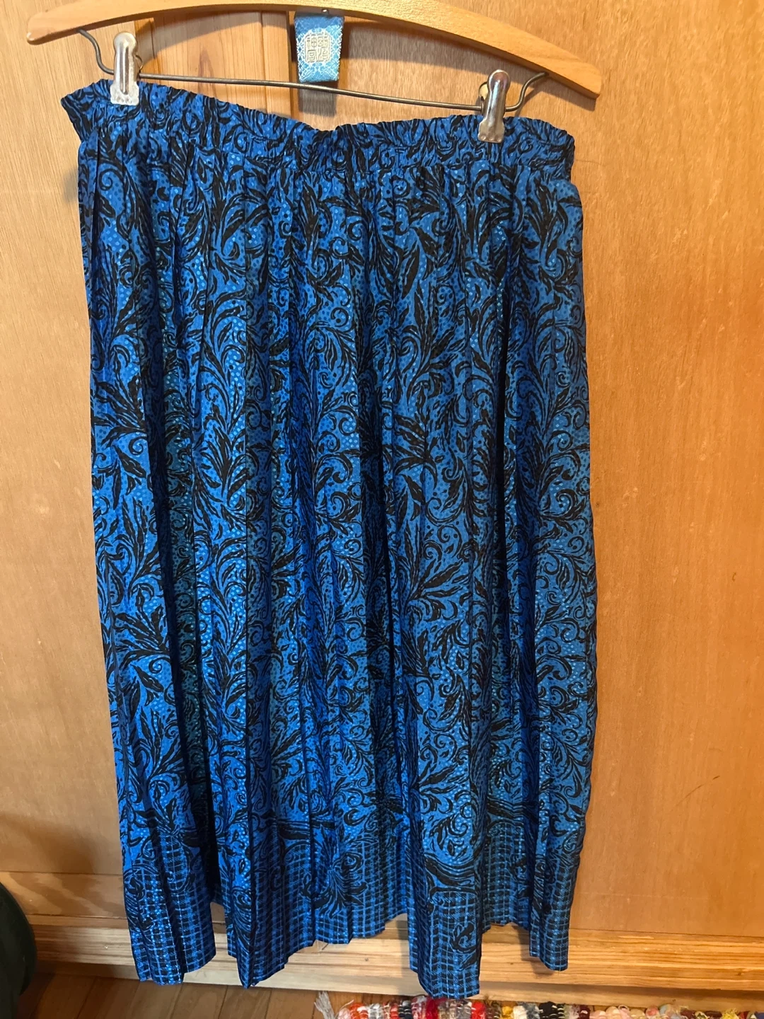 This Andrea Gayle maxi skirt features a vibrant blue and black floral print. It has an elastic waistband for a comfortable fit. Made from a polyester blend fabric.
