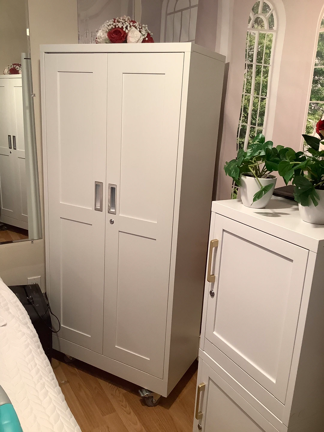 White Two-Door Storage Cabinet with Wheels