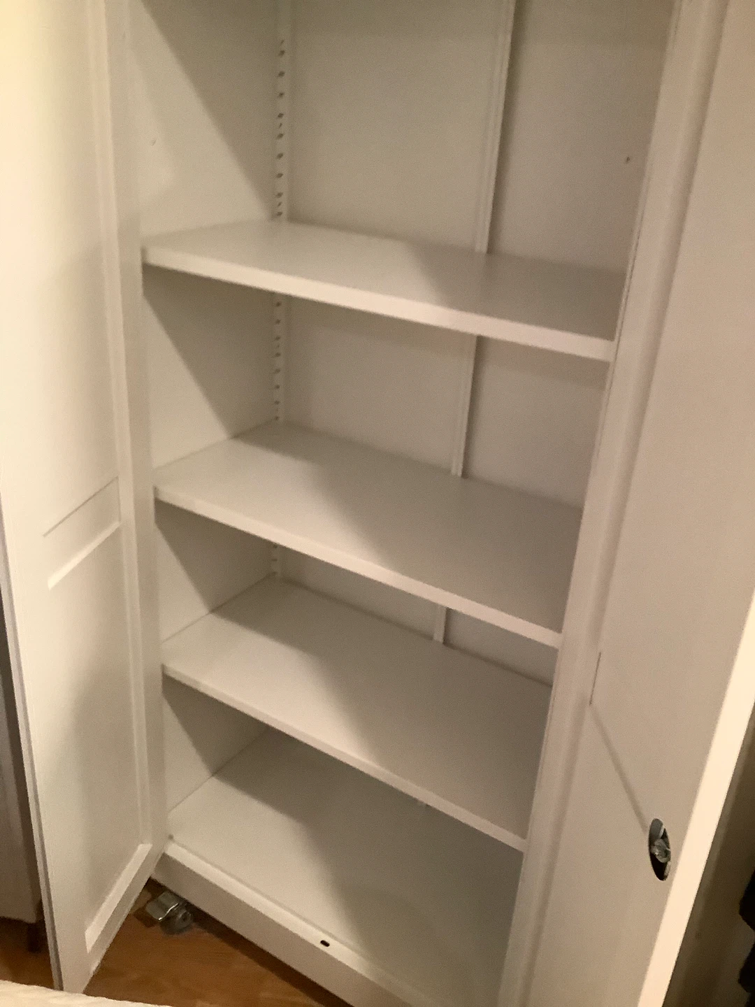 White storage cabinet with two doors and wheels. Features adjustable shelves inside. It's a great option for organizing items in any room!