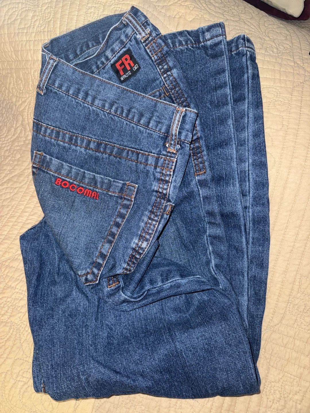 Blue denim jeans with FR certification. Features embroidered BOCOMAH logo on the back pocket. These jeans are made of durable denim.36 X32