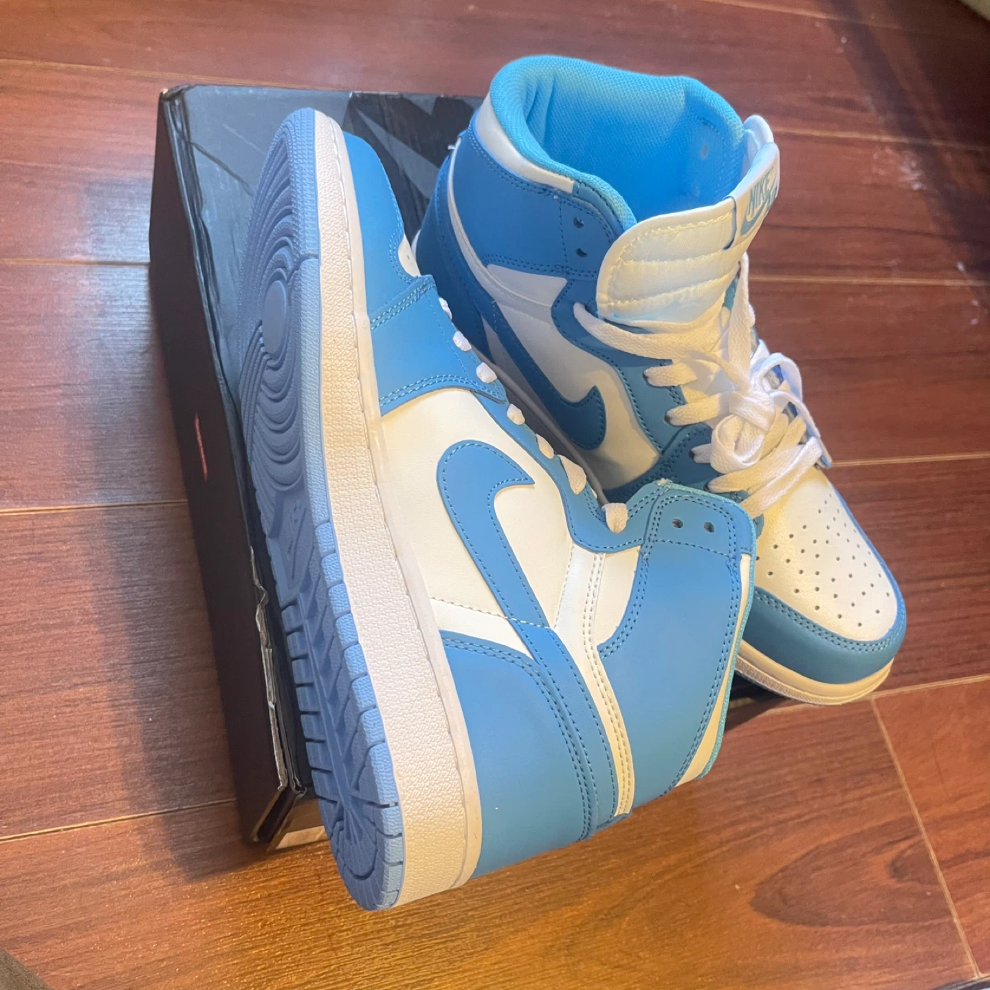 These are Nike Air Jordan 1 High sneakers in a University Blue and White colorway. They feature the classic high-top silhouette. Includes original box.