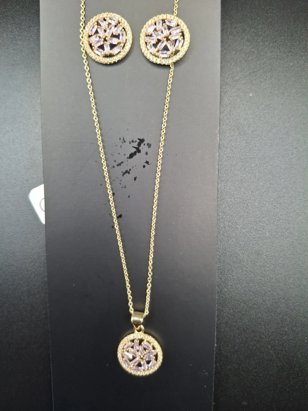 This is a gold tone necklace and matching earrings set. The jewelry features round pendants with clear and pink stones. It's a lovely accessory for any occasion!