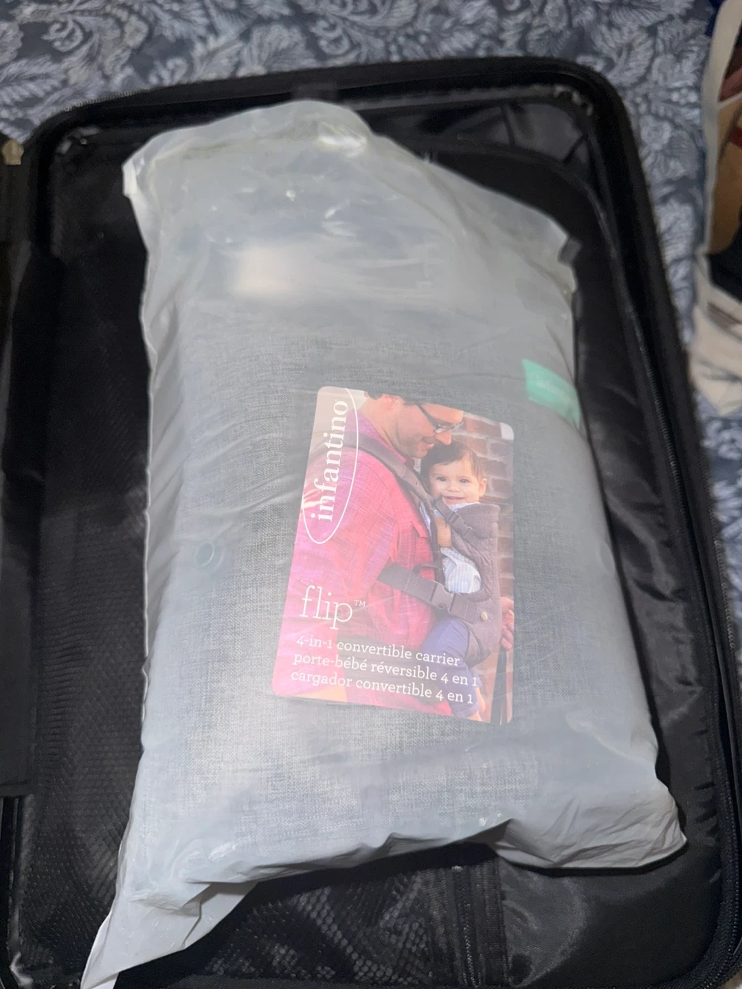This Infantino Flip 4-in-1 convertible carrier offers multiple carrying positions. It's designed for versatility and comfort. The carrier is gray and made of fabric.