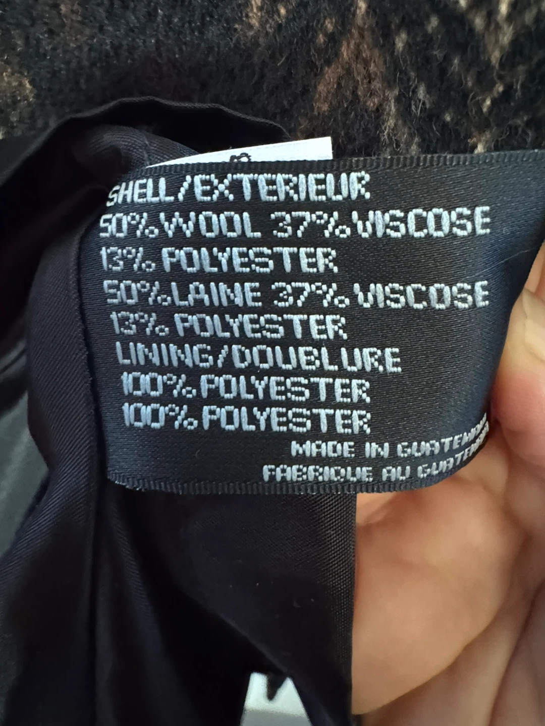I'm selling a Via Spiga Black and Cream Double Breasted Belted coat in size 14. The shell is made of 50% wool, 37% viscose, and 13% polyester. The lining is 100% polyester. It's a stylish and warm coat for the colder months!