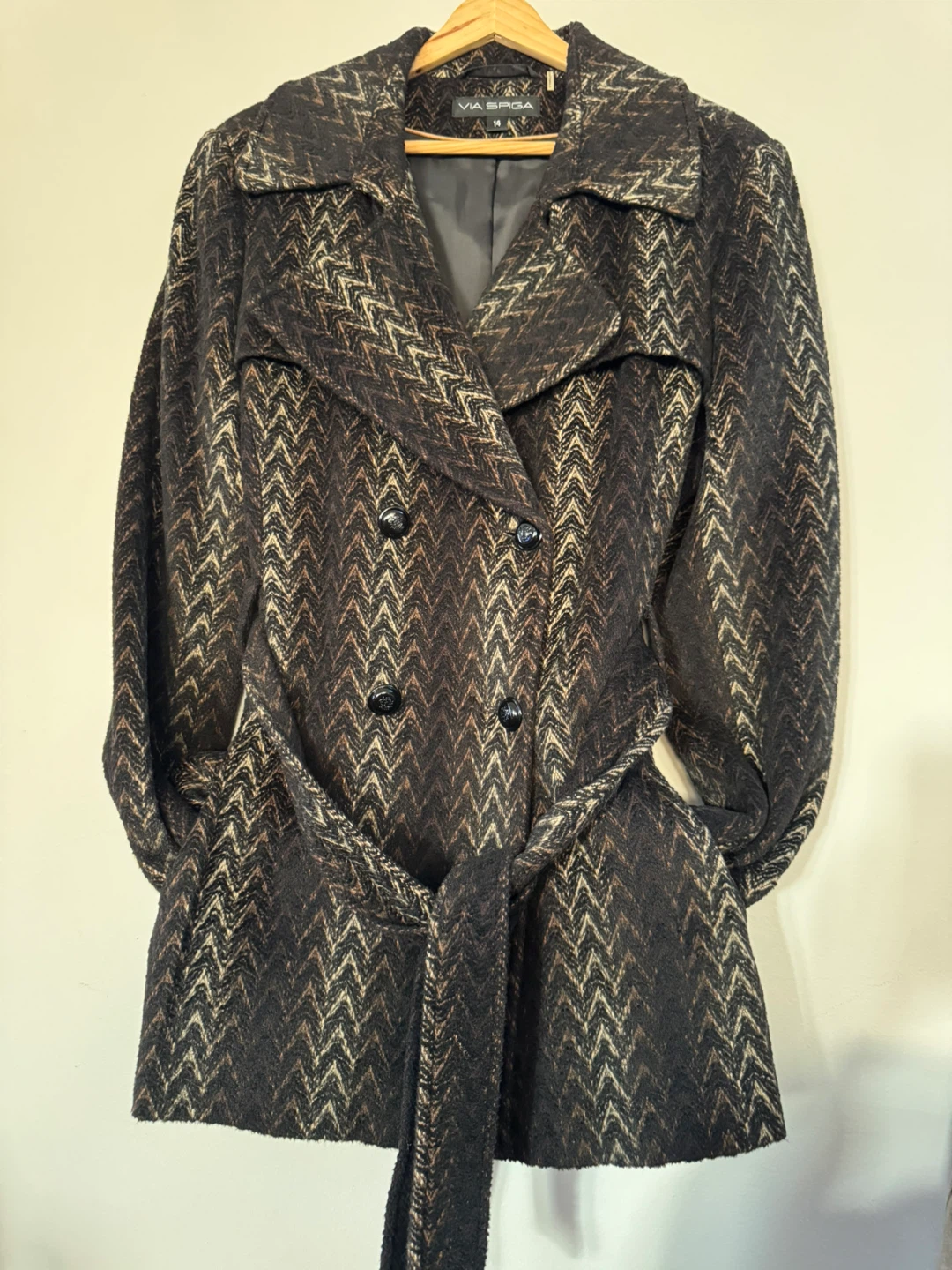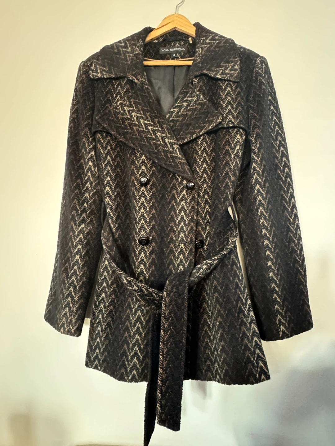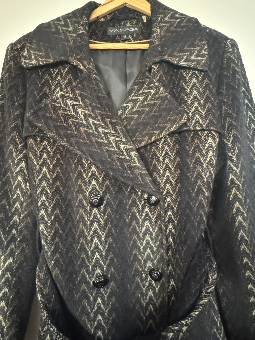 I'm selling a Via Spiga Black and Cream Double Breasted Belted coat in size 14. The shell is made of 50% wool, 37% viscose, and 13% polyester. The lining is 100% polyester. It's a stylish and warm coat for the colder months!