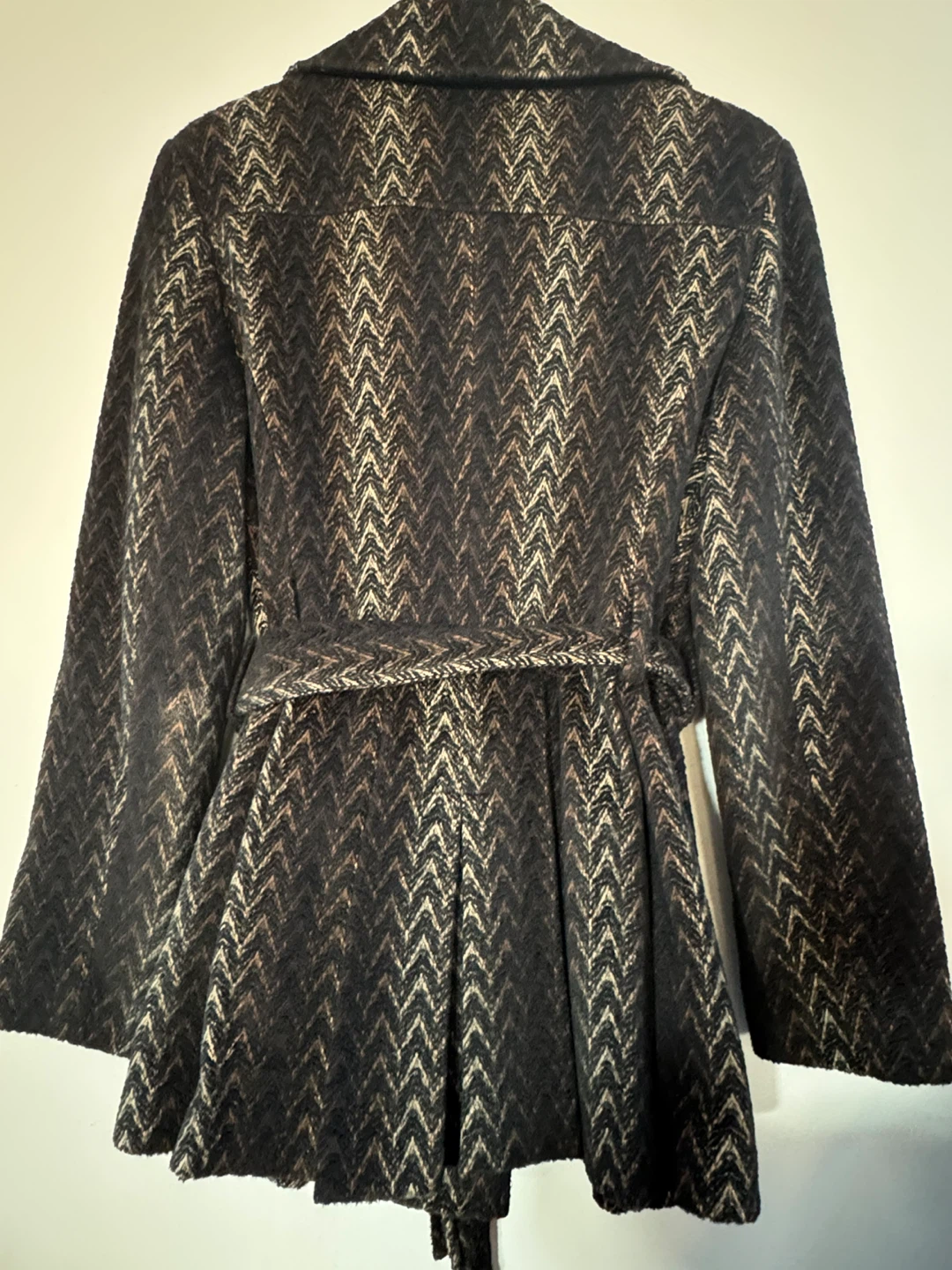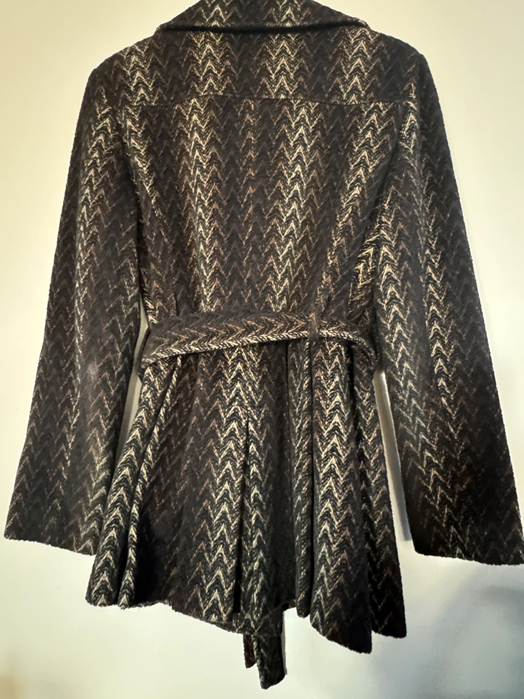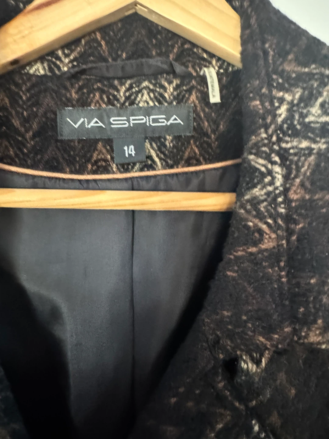I'm selling a Via Spiga Black and Cream Double Breasted Belted coat in size 14. The shell is made of 50% wool, 37% viscose, and 13% polyester. The lining is 100% polyester. It's a stylish and warm coat for the colder months!