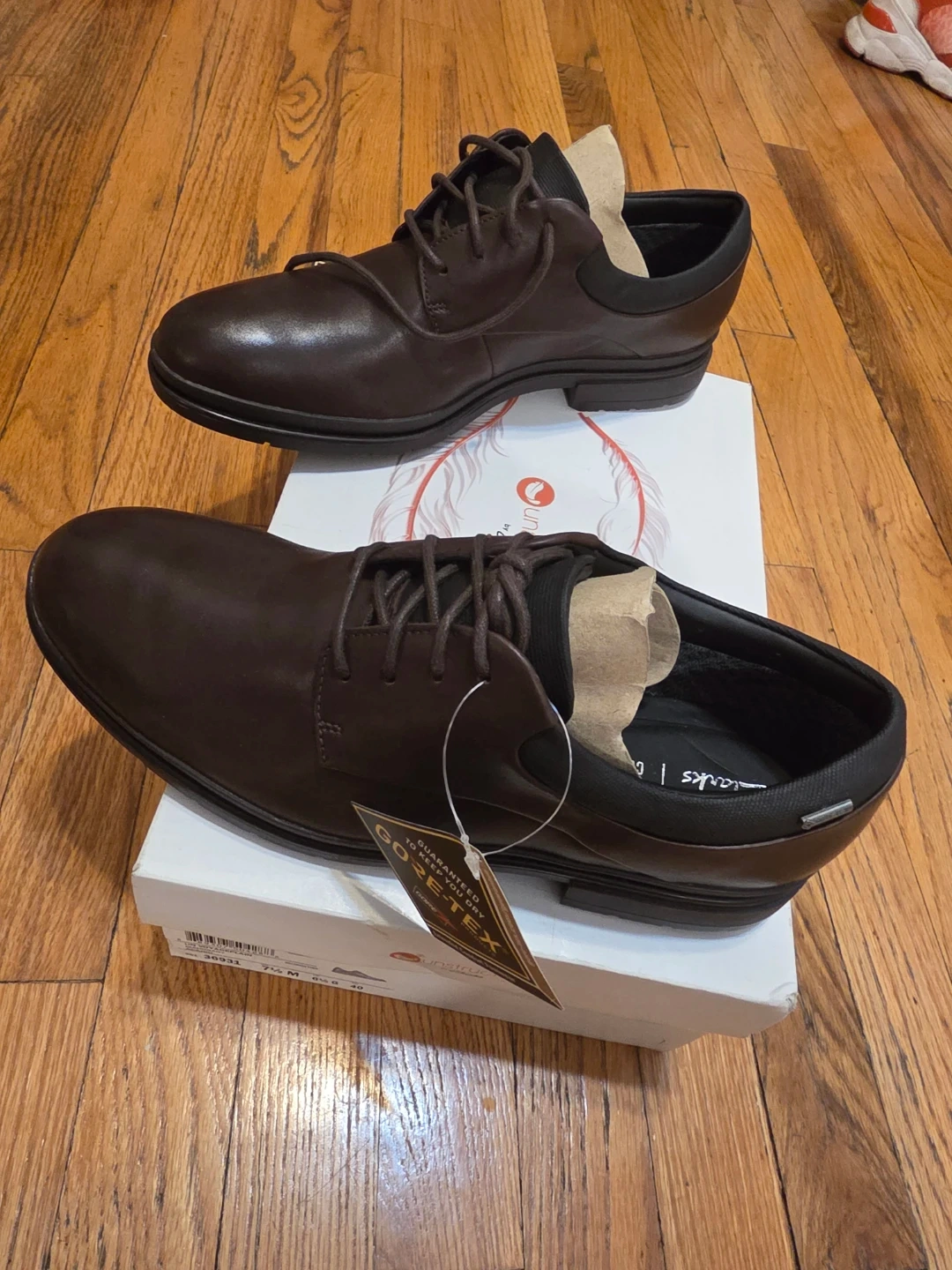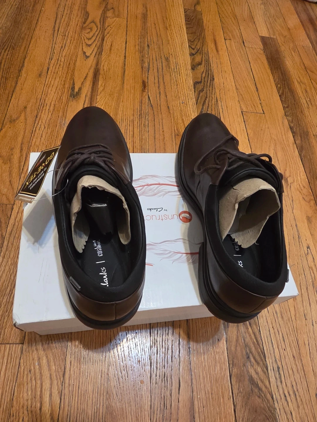 Men's Clarks Unstructured "Un Voyage Plain" shoes. Mahogany color. Lace-up style. Includes original box and GORE-TEX waterproofing. Size 7.5 M US.