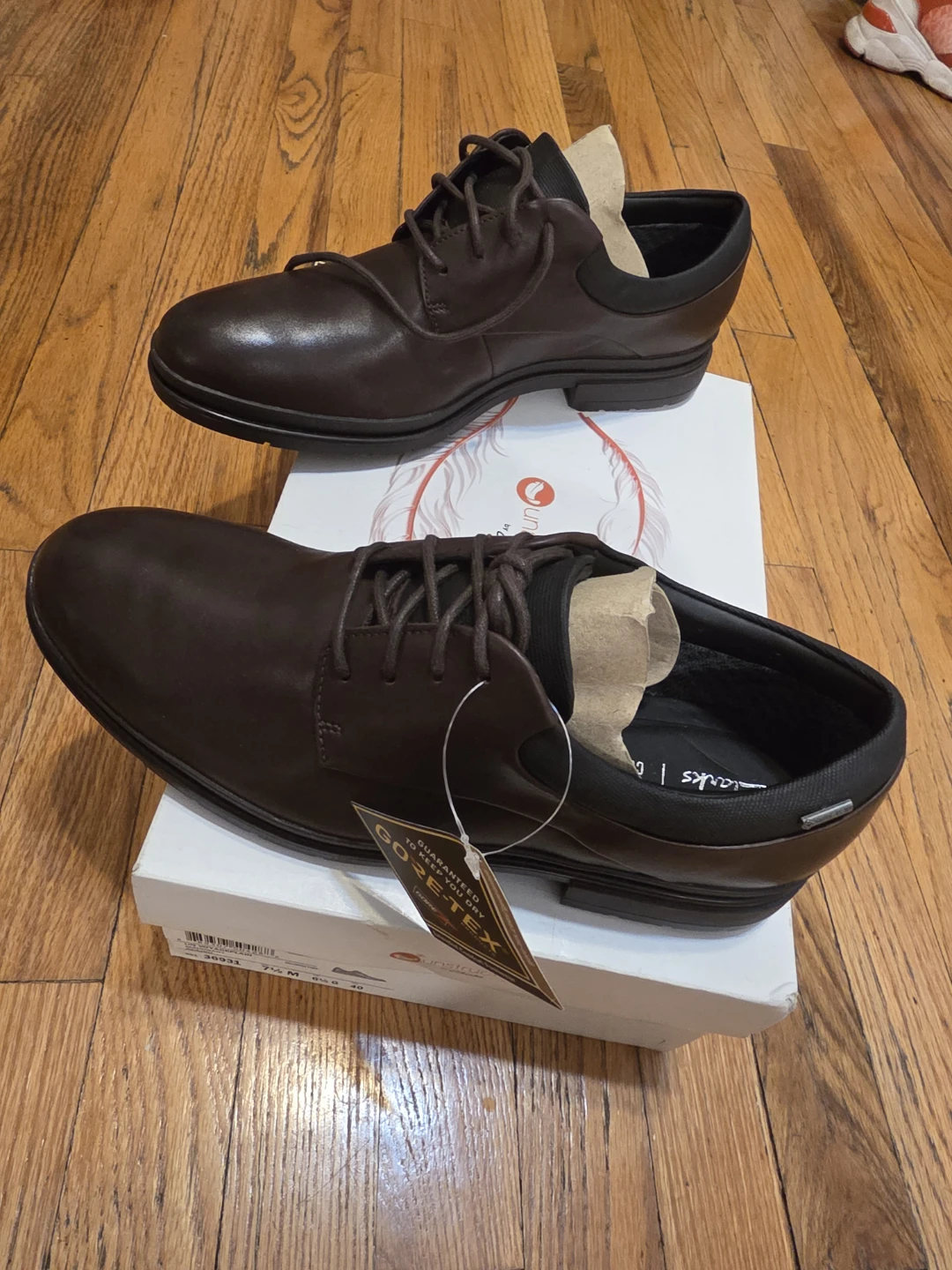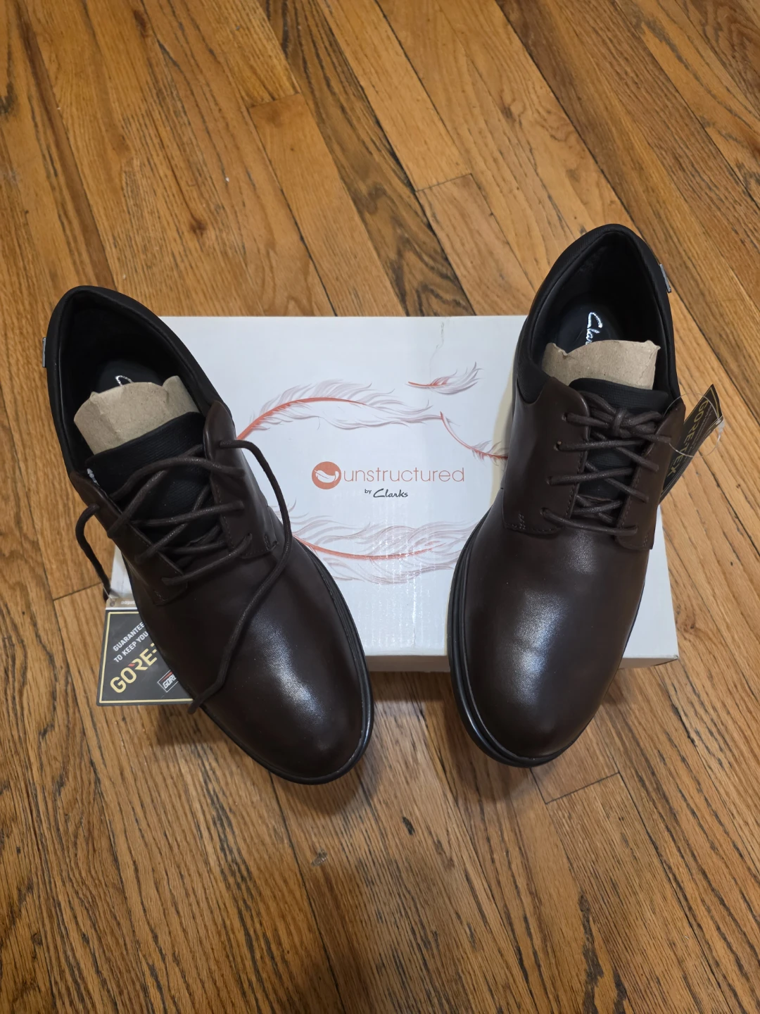 Men's Clarks Unstructured "Un Voyage Plain" shoes. Mahogany color. Lace-up style. Includes original box and GORE-TEX waterproofing. Size 7.5 M US.