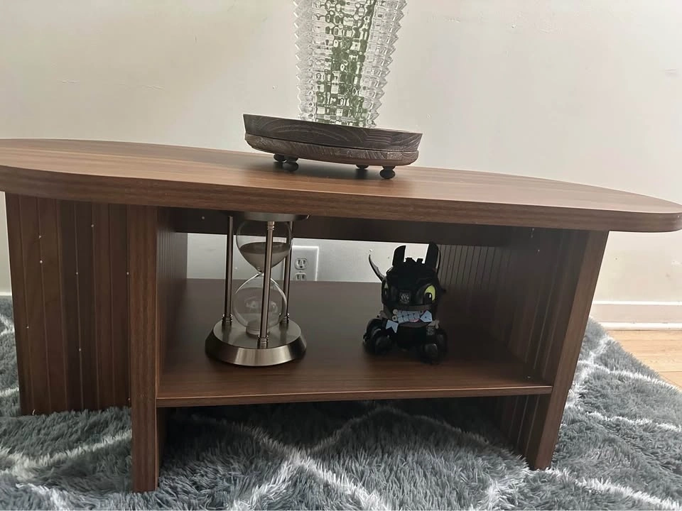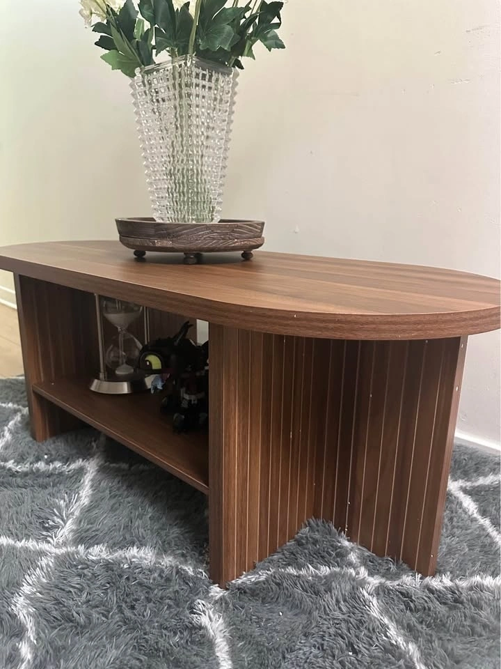 43.3 Inch Side Table with Storage, Oval Coffee Tables for Living Room, Farm Fluted Coffee Table with Large Storage Shelf, Walnut Wood Center Table