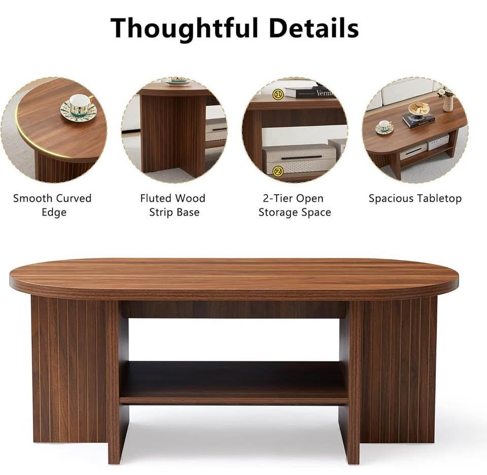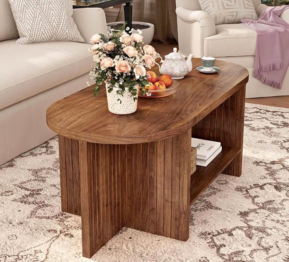 43.3 Inch Side Table with Storage, Oval Coffee Tables for Living Room, Farm Fluted Coffee Table with Large Storage Shelf, Walnut Wood Center Table